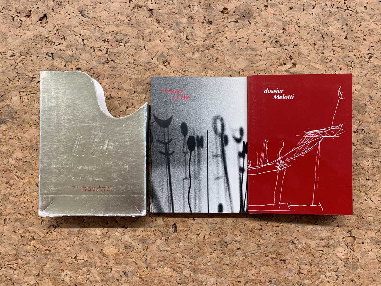Piccolo cofanetto contenente un volume riccamente illustrato ('L'amore a Celle. I Melotti di casa Gori' con fotografie di Marina Franci e prefazione di Carlo Bertelli) e un fascicolo con interno fustellato composto da numerosi pieghevoli relativi a immagini, fotografie, documenti e lettere inerenti l'Artista