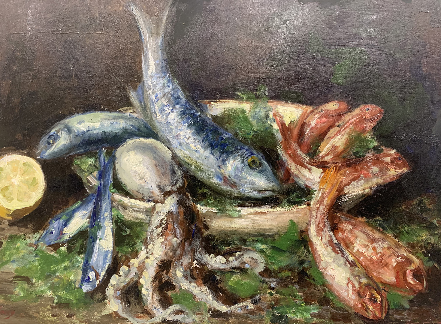 Cocco Giuseppe Alberto (Chieti 1869 - Napoli 1963), Natura morta di pesci e molluschi