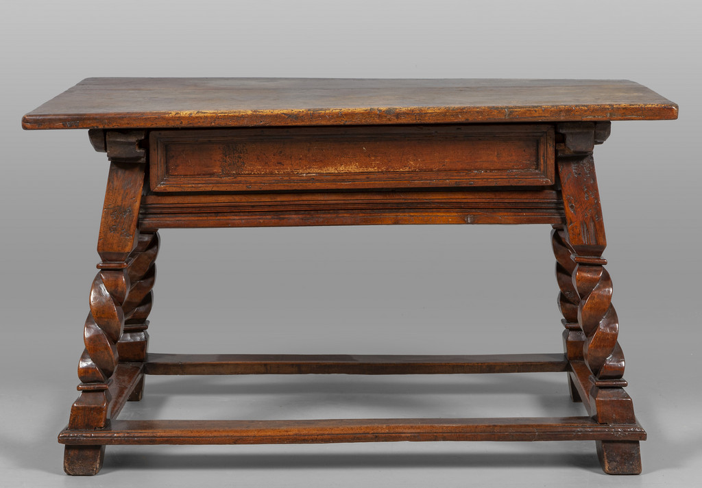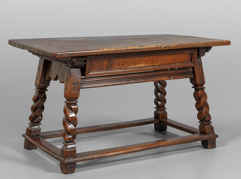 Tavolo da centro in noce gambe a torciglione raccordate da traverse un cassetto nella fascia probabilmente Val d'Aosta sec.XVII