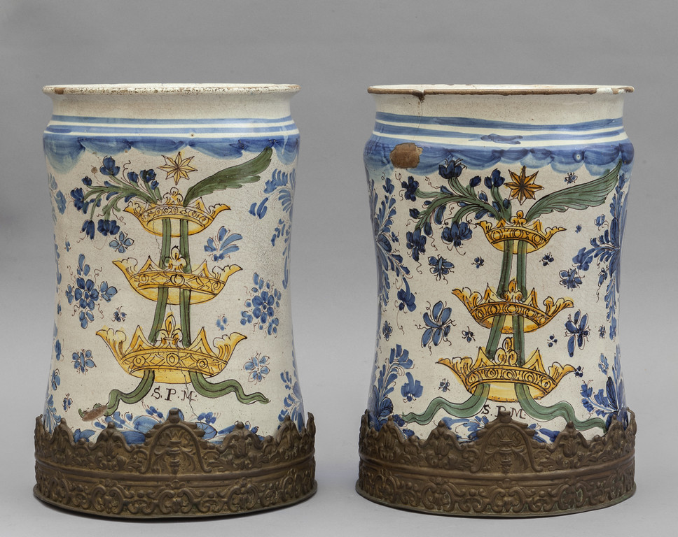 Coppia di grandi albarelli in maiolica decorati in policromia con stemma con tre corone Napoli sec.XVII