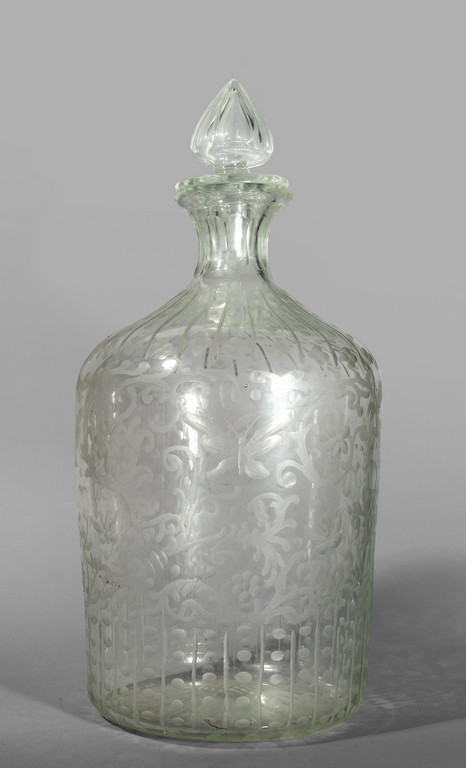 Grande bottiglia in vetro molato con figure di farfalle fiori e libellule ripetute su tutto il corpo ed inserite in una trama a ramage Firenze sec.XVIII