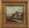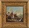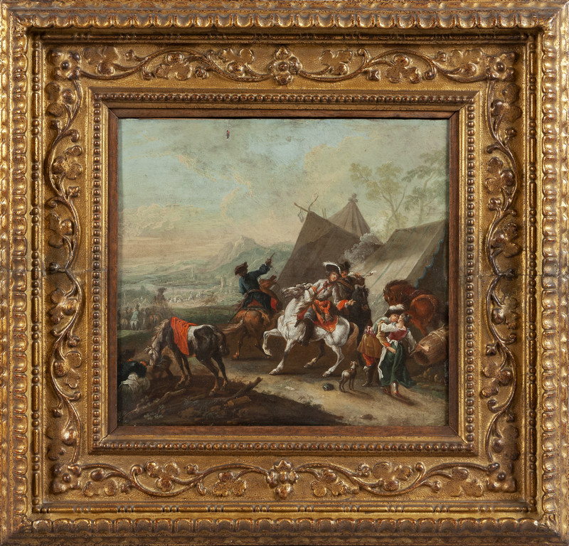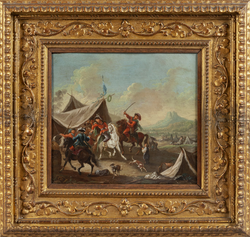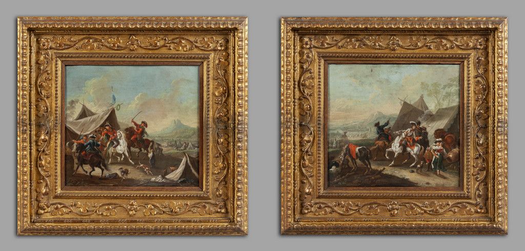 Scuola francese sec.XVIII 'Cavalieri nell'accampamento' coppia di olii su rame cornici in legno intagliato