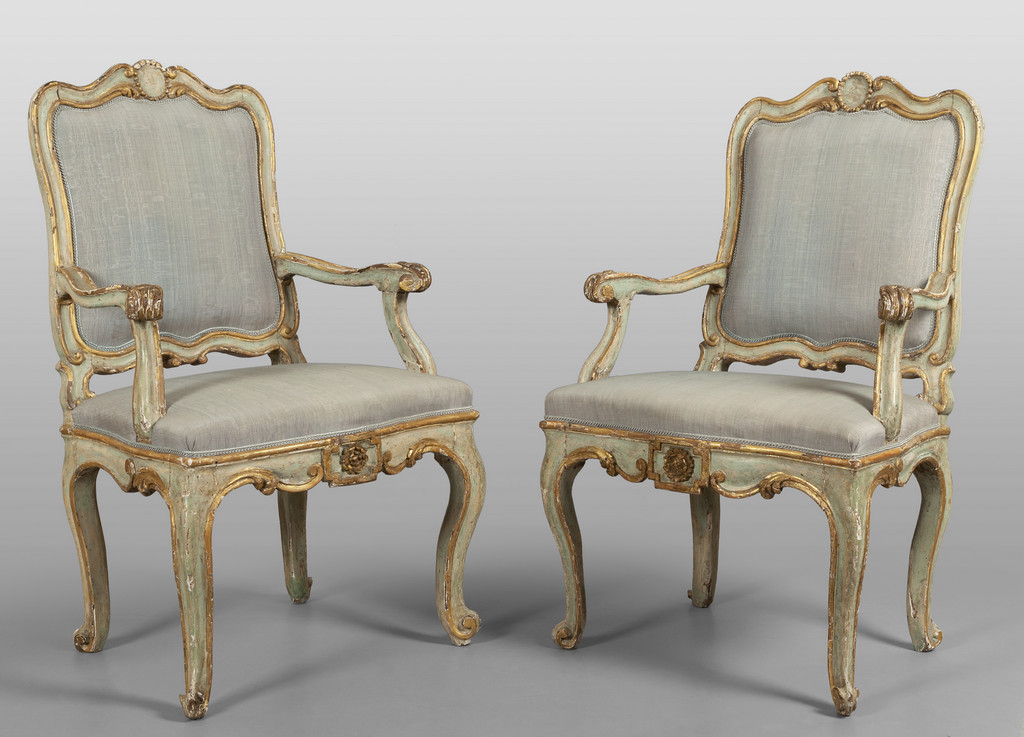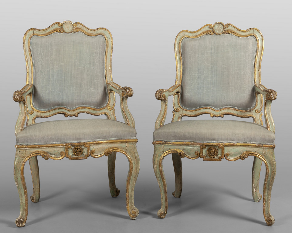Coppia di poltrone Luigi XV in legno intagliato laccato e dorato Italia Centrale sec.XVIII