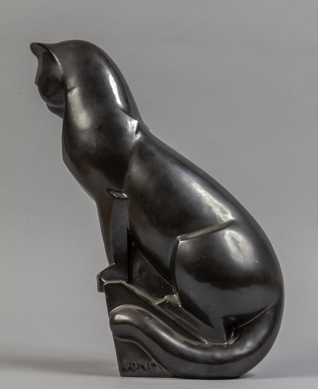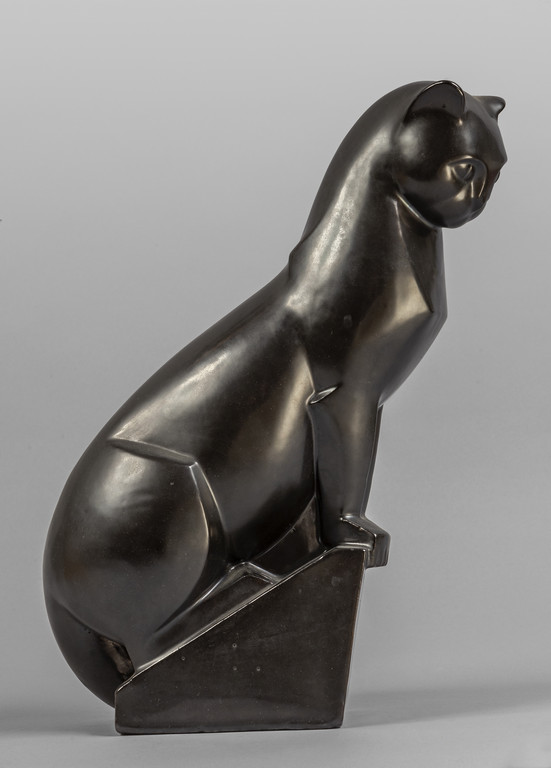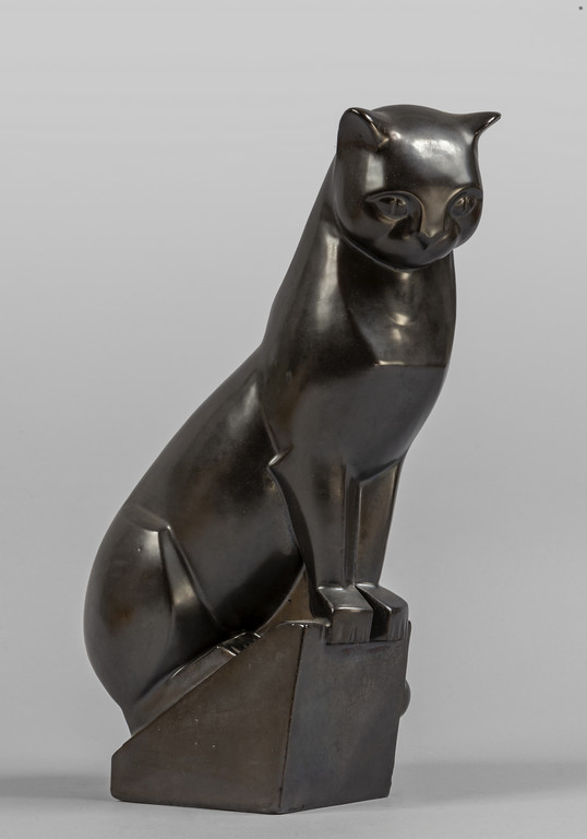 Gatto scultura Decò in ceramica lustrata grigia inizi sec.XX