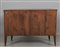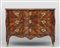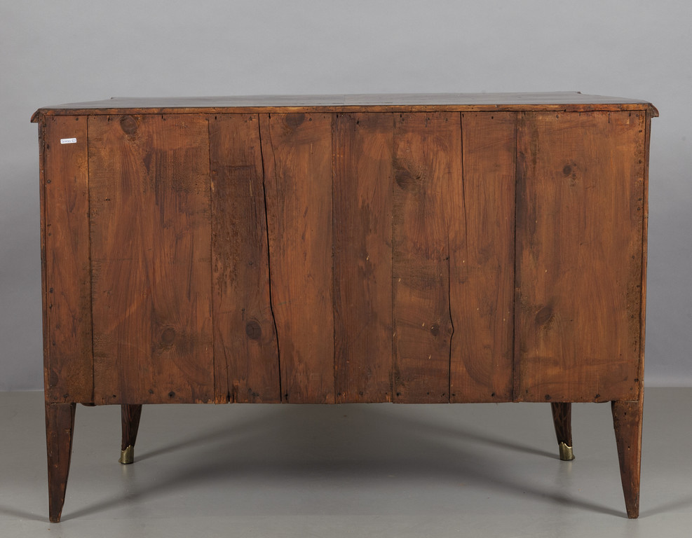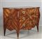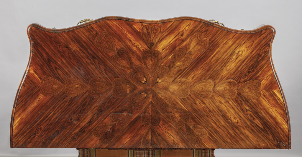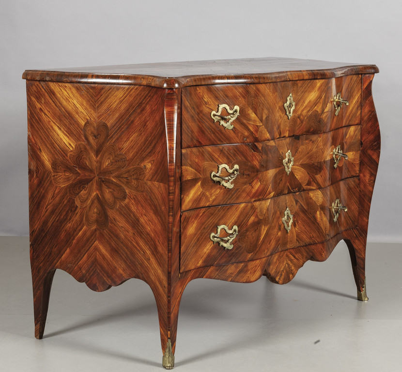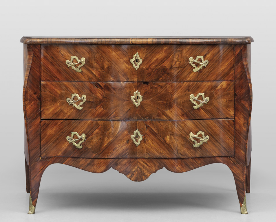 Cassettone a tre cassetti fronte con mossa ondulata a duplice convessità fianchi movimentati a convessità crescente lastronato in legno di viola con ricchissima decorazione con il motivo del cuore ripetuto sul fronte sui fianchi e sul piano maniglie in bronzo cesellato Genova Barocchetto genovese metà sec.XVIII