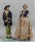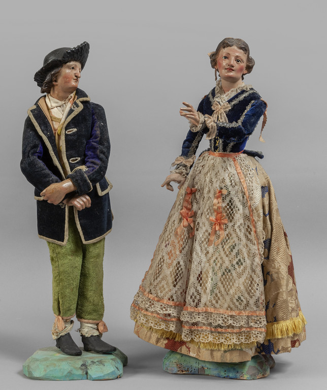 Contadino e contadina coppia di grandi figure da presepe in legno finemente intagliato e laccato abiti d'epoca Genova sec.XVIII