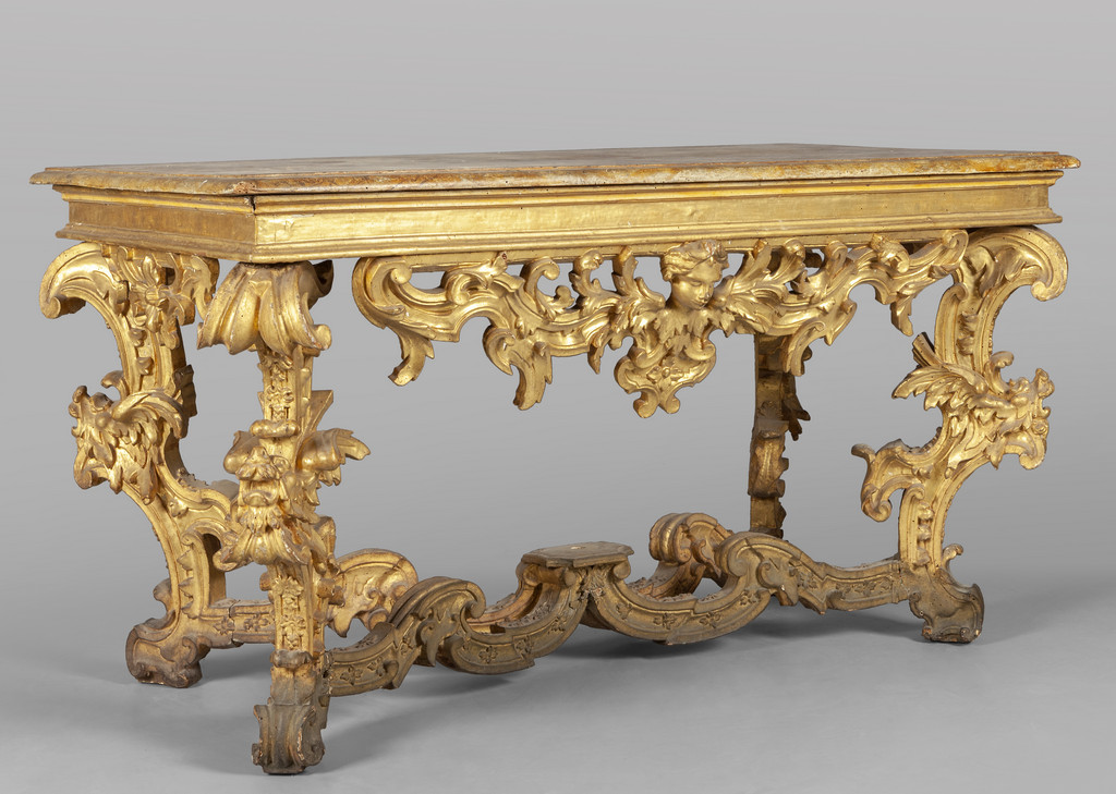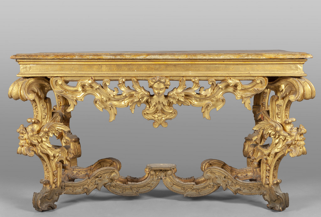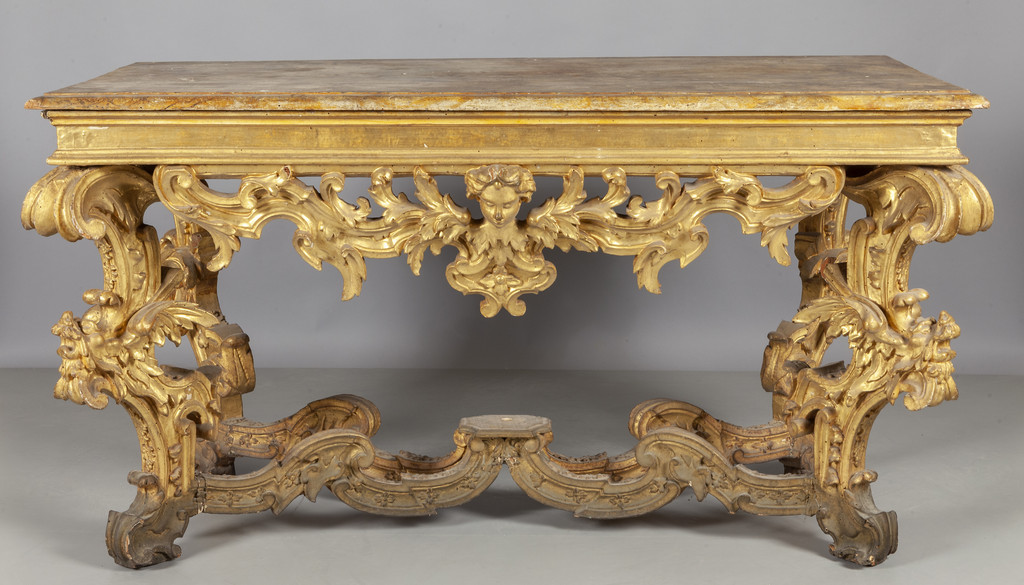 Importante grande tavolo a console in legno dorato e finemente intagliato al centro testa di angelo nei montanti figure di draghi gambe raccordate da crocera (mancante del vasetto centrale) piano in legno coevo Toscana I metà sec.XVIII