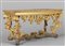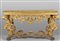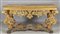 Importante grande tavolo a console in legno dorato e finemente intagliato al centro testa di angelo nei montanti figure di draghi gambe raccordate da crocera (mancante del vasetto centrale) piano in legno coevo Toscana I metà sec.XVIII