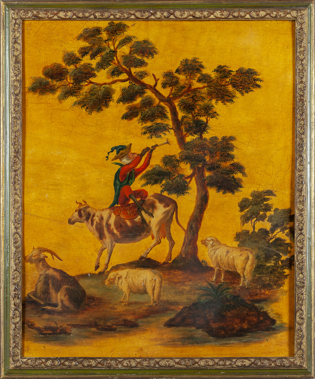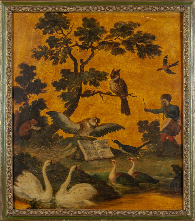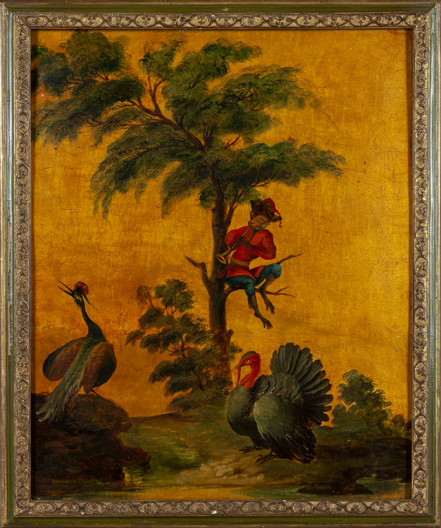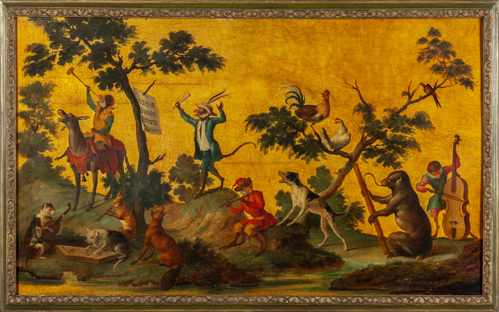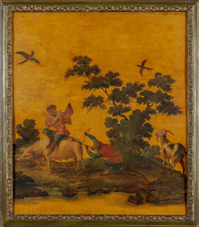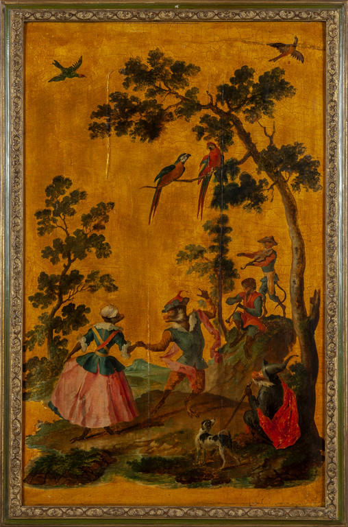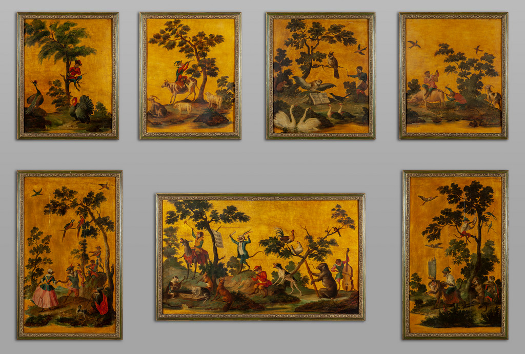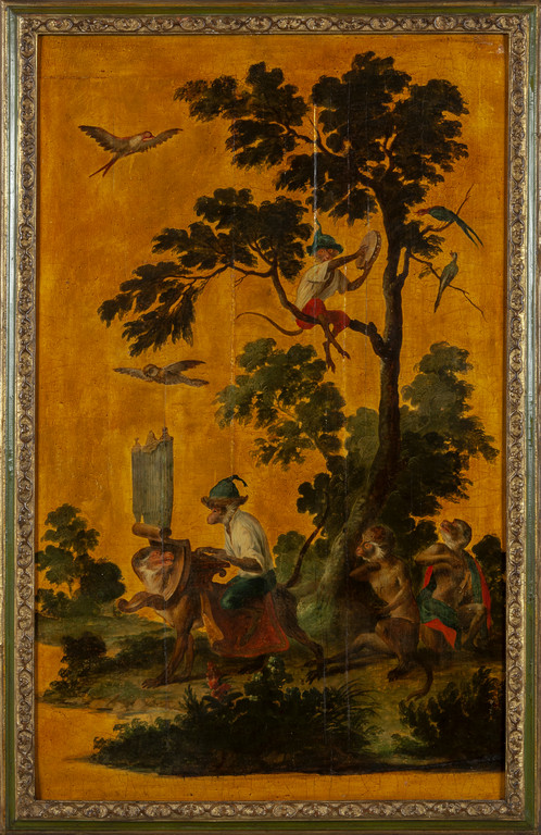 'La favole del matrimonio delle scimmie nel bosco' sette pannelli in legno dipinti ad olio in policromia su fondo oro