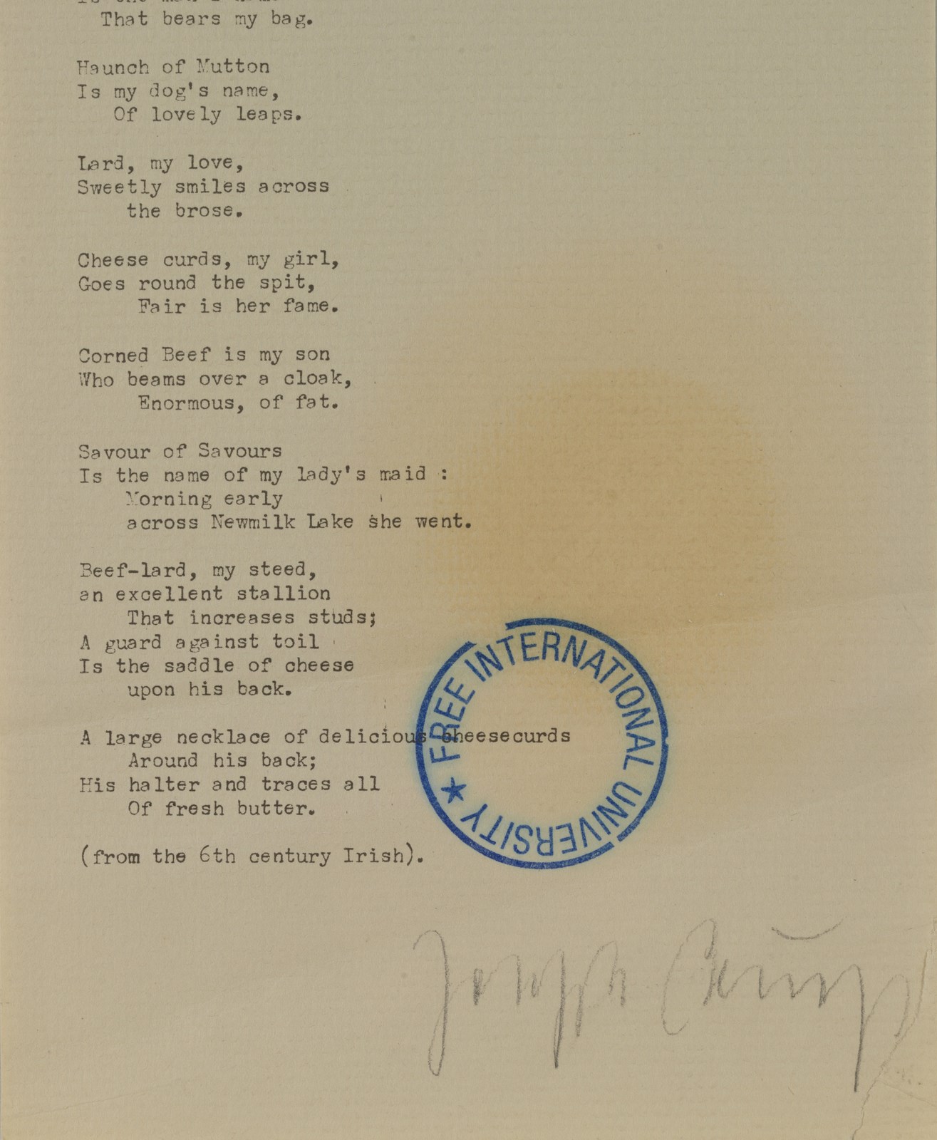 BEUYS JOSEPH (1921 - 1986) Food for Thought. 1977. Litografia offset. Cm 16,50 x 88,00. Firma a matita in basso. Timbro Free International University. Pubblicazione: J. Schellmann, Joseph Beuys Multiples, Catalogue Raisonné of Multiples and Prints 1965-1985, New York, 1985, n. 206. Difetti.