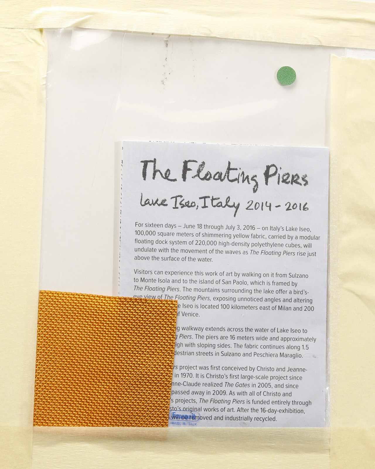 CHRISTO (1935 - 2020) The Floating Piers. 2014. Multiplo. Cm 28,50 x 20,00. Firma e data a stampa in alto a sinistra. Titolo in basso a destra. Al retro in allegato lembo di tessuto utilizzato per l'installazione. Cornice presente