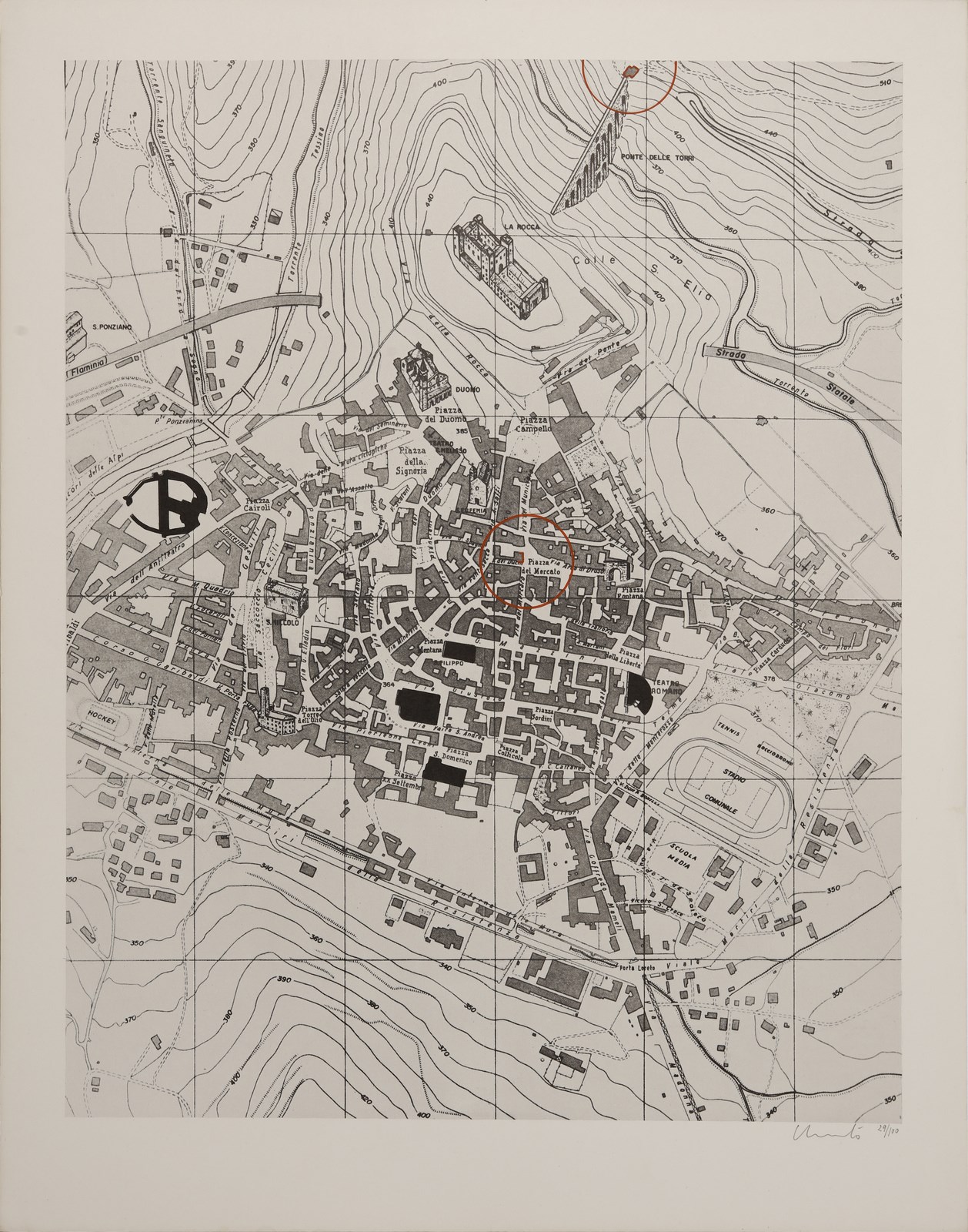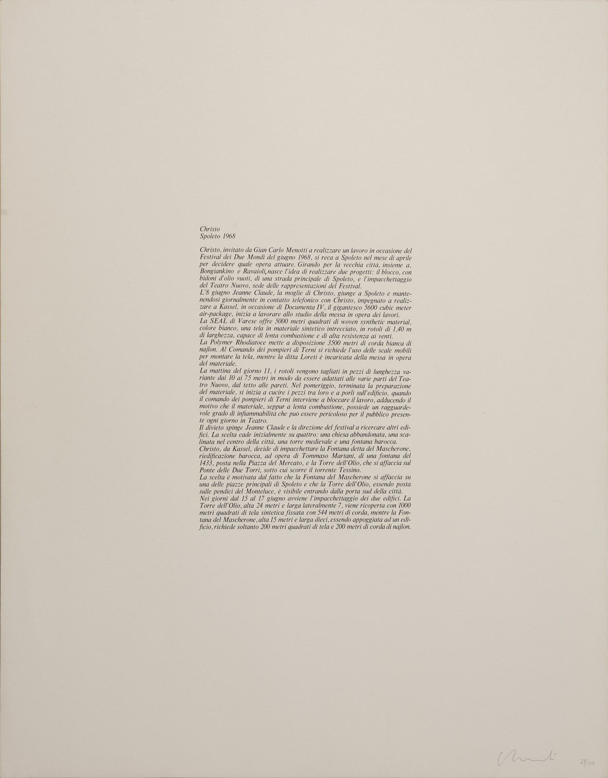 CHRISTO (1935 - 2020) Packed fountain and packed tower, Spoleto. Serigrafia e collage. Cm 65,00 x 81,00. 29/100. Cartella composta da n.5 fogli ( una a colori con collage e spago) firmati e numerati in basso a matita. Carta Fabriano. Edizioni Multicenter, Milano. 1968 - 1972. Sitografia storiografia: https://christojeanneclaude.net/artworks/wrapped-fountain-and-tower/