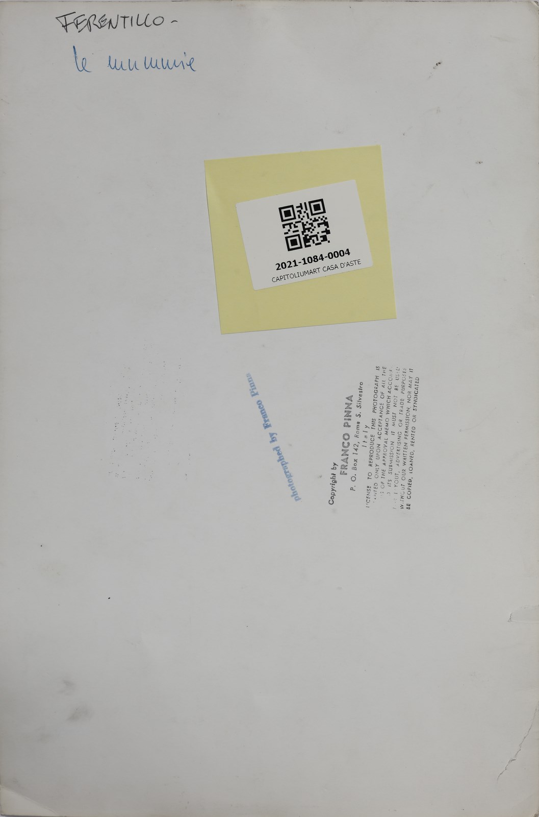 PINNA FRANCO (1925 - 1978) Le mummie. Foto in bianco e nero. Cm 36,00 x 24,00. Al retro credito dell'artista. Difetti. Provenienza: Casa Bernardino Zapponi, uno degli storici sceneggiatori di Federico Fellini. Franco Pinna è il fotografo che ha seguito il Maestro in tanti film e fatto la storia anche dell’immaginario felliniano. La foto presentata proviene però dal periodo della sua collaborazione con il grande antropologo Ernesto De Martino, il padre della moderna antropologia, con il quale lavorò a lungo verso la metà degli anni 50 girando l’Italia magica e misteriosa come il Salento, La Lucania, documentando e raccontando fenomeni come ad esempio il tarantismo.