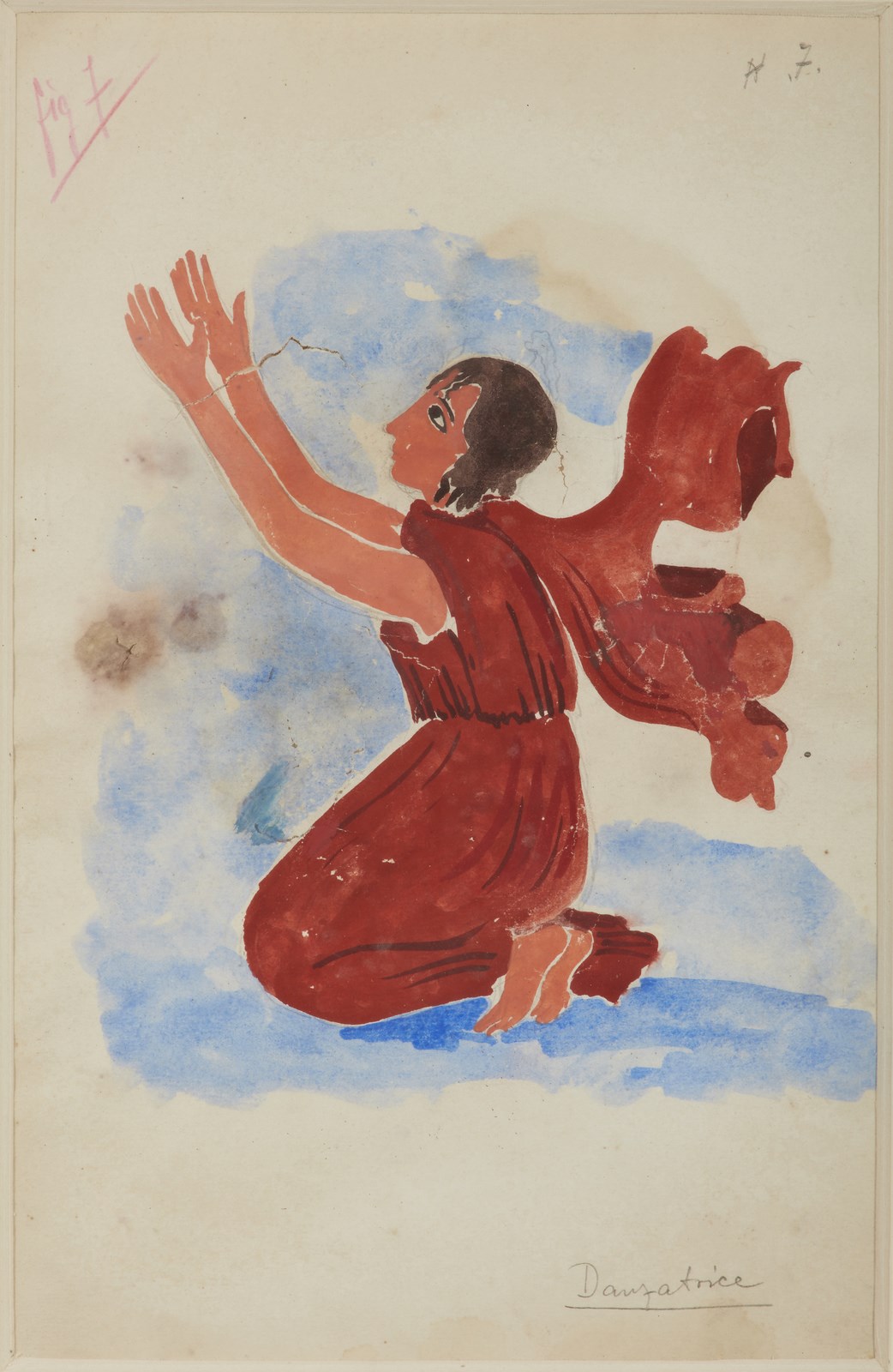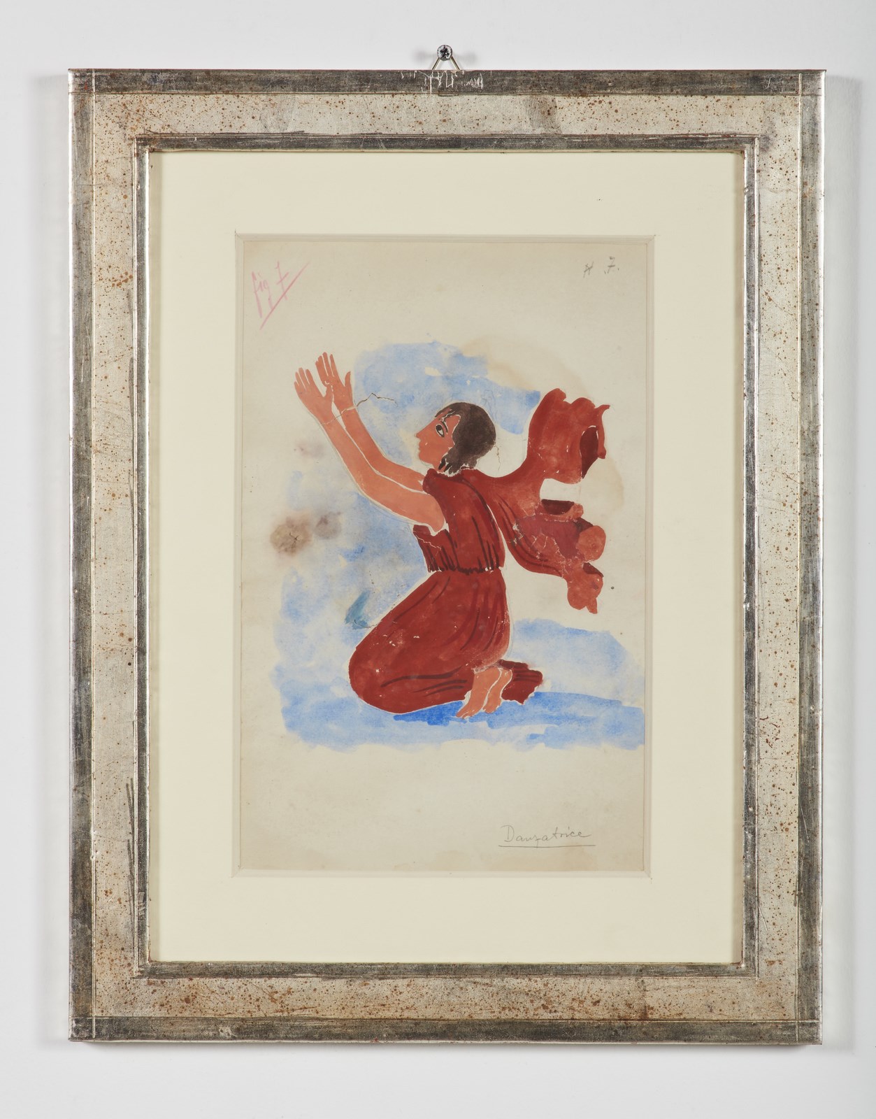 CASORATI FELICE (1883 - 1963) Danzatrice. Tempera su carta. Cm 21,00 x 31,00. Titolo in basso a destra. Opera archiviata presso l'Archivio Generale delle opere fi Felice Casorati, Torino, come da documentazione fotografica allegata all'opera riportante il relativo numero d'inventario. Anni '40. Difetti.