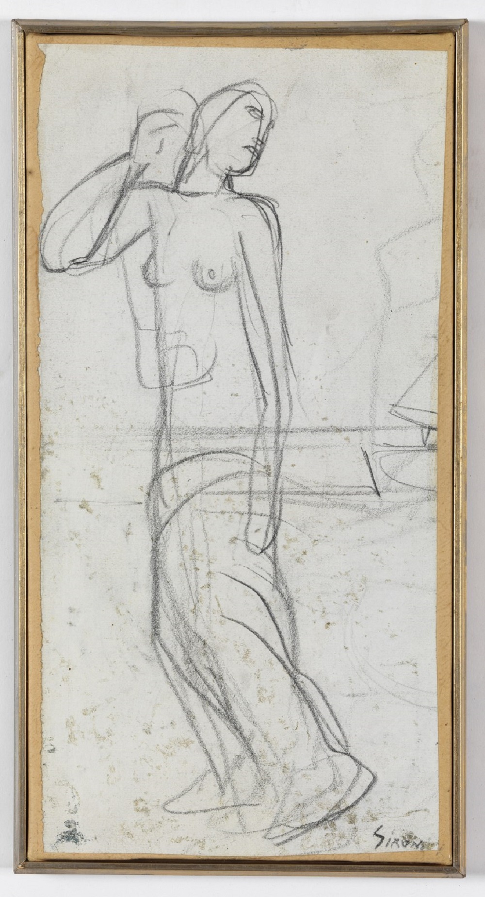 SIRONI MARIO (1885 - 1961) Figura. 1927. Matita grassa su carta. Cm 14,00 x 28,00. Firma apocrifa in basso a destra (probabilmente di Matilde Fabbrini Sironi). Opera archiviata presso l'Associazione per il Patrocinio e la Promozione dell'opera di Mario Sironi, Milano come da documentazione allegata all'opera riportante il relativo numero d'inventario. Cornice presente