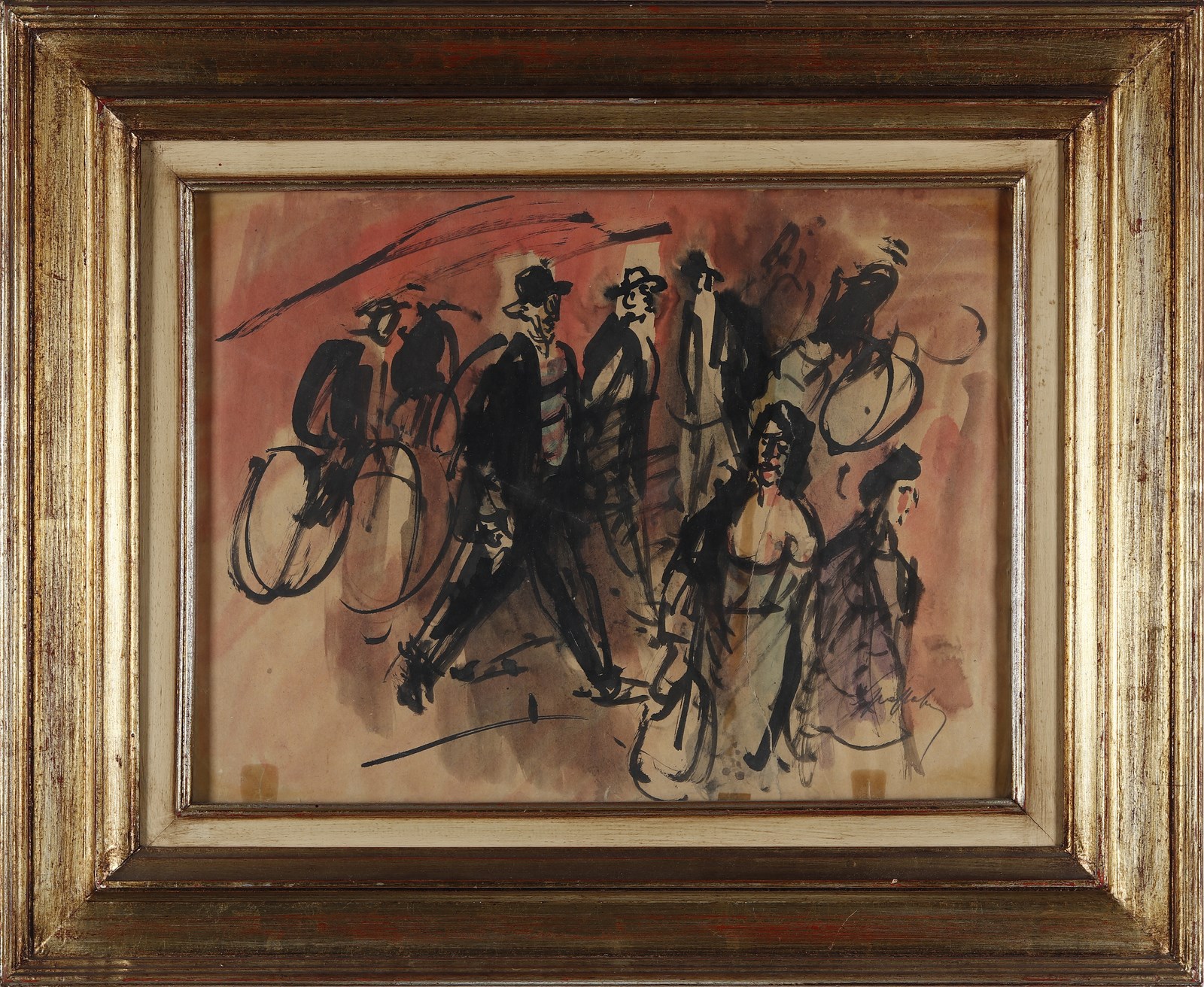 SPAZZAPAN LUIGI (1889 - 1958) In strada. China colorata su carta. Cm 49,60 x 37,70. Firma in basso a destra. Al retro cartiglio della Galleria Gissi, Torino. Dichiarazione di autenticità della Galleria Gissi, Torino. Pubblicazione: Catalogo generale delle opere di Lugi Spazzapan a cura di S. Alberti e A. Dragone, Torino 1981. Cornice presente
