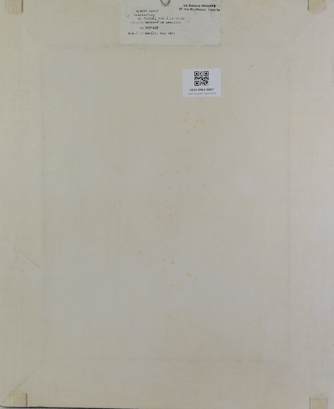 HUYOT ALBERT (1872 - 1968) Ne touche pas à la Reine. 1921. Collage su carta. Cm 22,50 x 33,50. Firma e anno in basso a destra. Al retro cartiglio descrittivo Galerie Mouffe, Parigi. Cornice presente