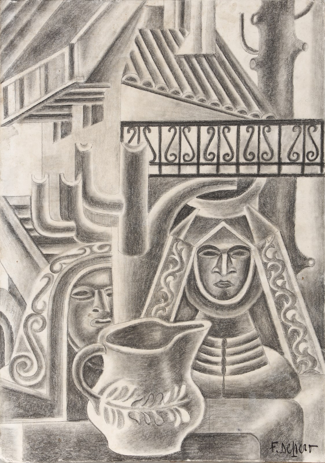 DEPERO FORTUNATO (1892 - 1960) Caraffa paesana. 1947. Carboncino su carta. Cm 30,00 x 40,00. Firma in basso a destra. Opera archiviata presso l' Archivio Unico per il Catalogo delle Opere Futuriste di Fortunato Depero, come da documentazione fotografica allegata all'opera riportante il relativo numero d'inventario. L'opera è lo studio per l'omonimo dipinto realizzato a Rovereto.