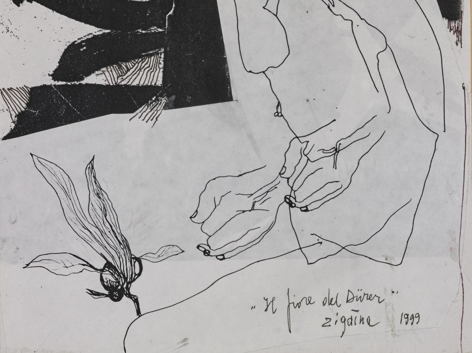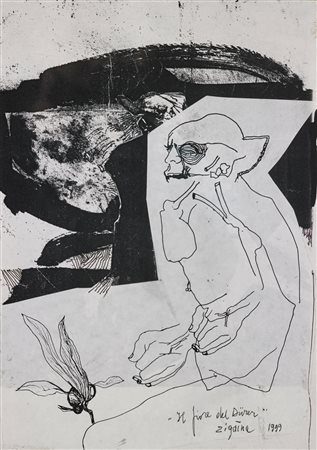 ZIGAINA GIUSEPPE (n. 1924) Il fiore del Durer. 1999. Tecnica mista su carta. Cm 19,00 x 26,70. Titolo, firma e anno in basso a destra. Autentica dell'artista su fotografia. Pubblicazione: Giuseppe Zigaina, Rex Eletrolux, Giugno 2004, p.25. Cornice presente
