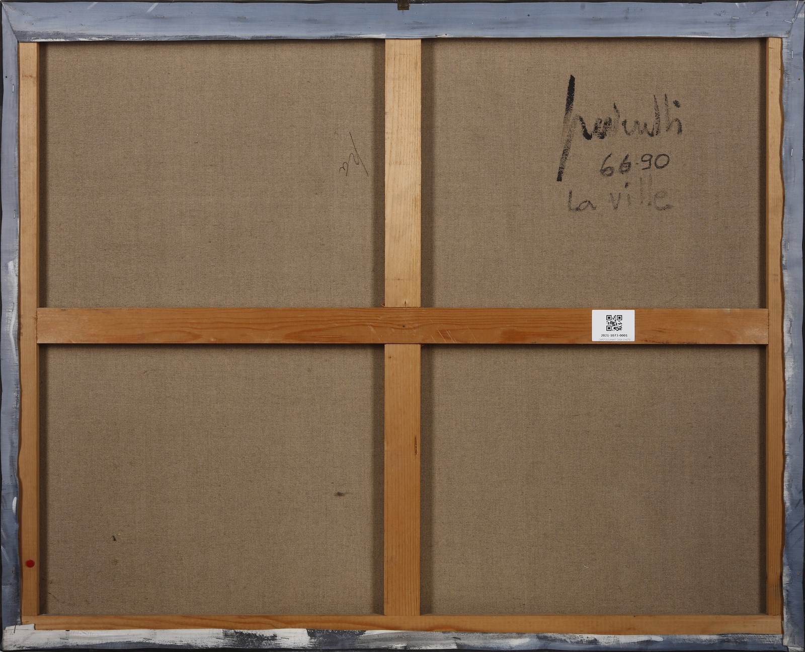 PEVERELLI CESARE (1922 - 2000) La Ville. 1990. Tecnica mista su tela. Cm 100,00 x 81,00. Firma in basso a destra. Al retro titolo, firma e anno. Cornice presente
