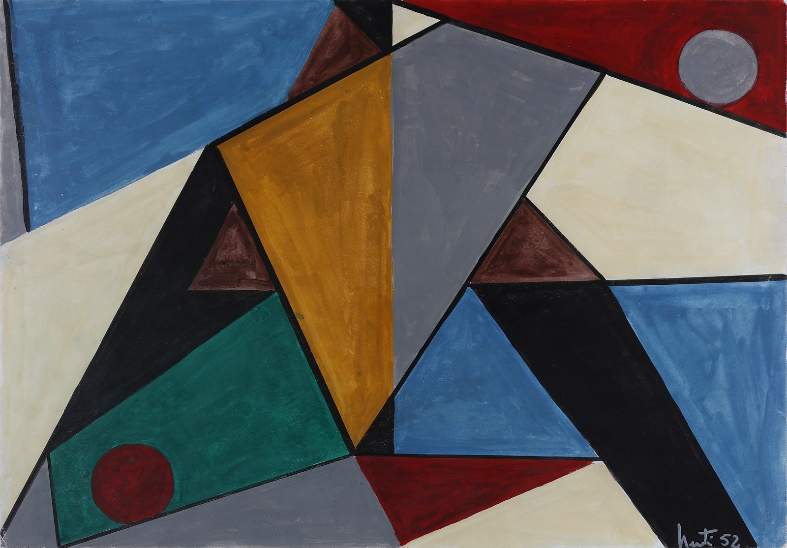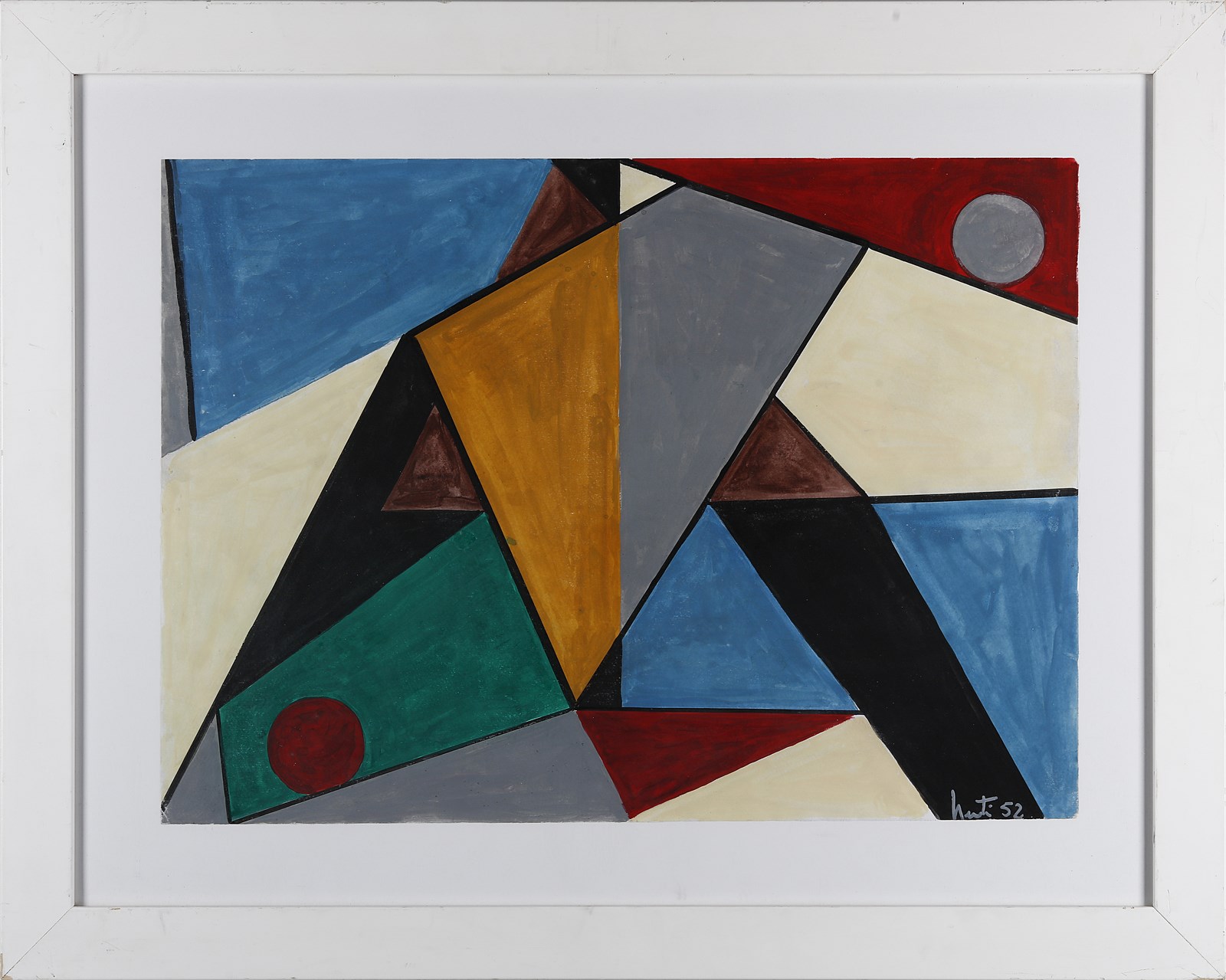 NUTI MARIO (1923 - 1996) Composizione. 1952. Tempera su carta. Cm 50,00 x 36,00. Firma e anno in basso a destra. Opera archiviata presso l'Archivio Mario Nuti come da documentazione fotografica allegata all'opera riportante il relativo numero d'inventario. Cornice presente