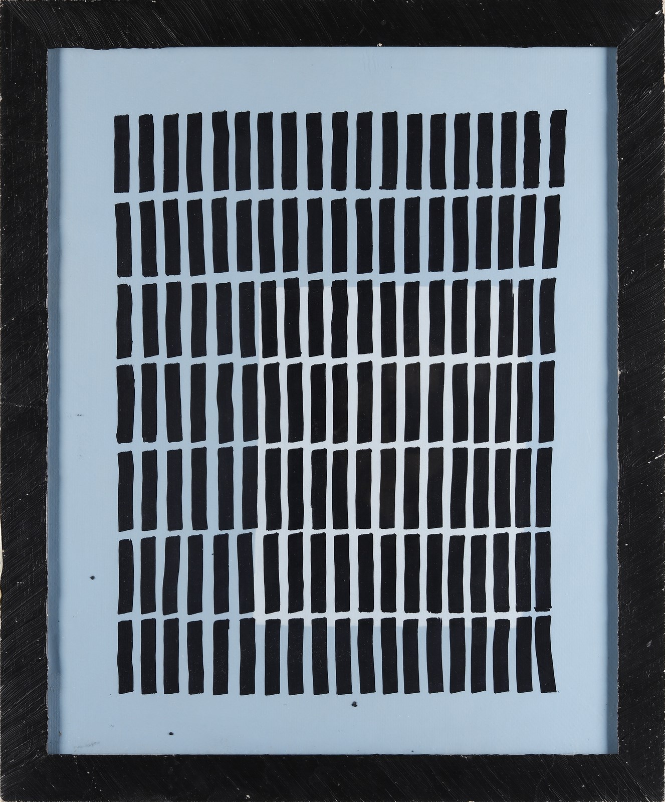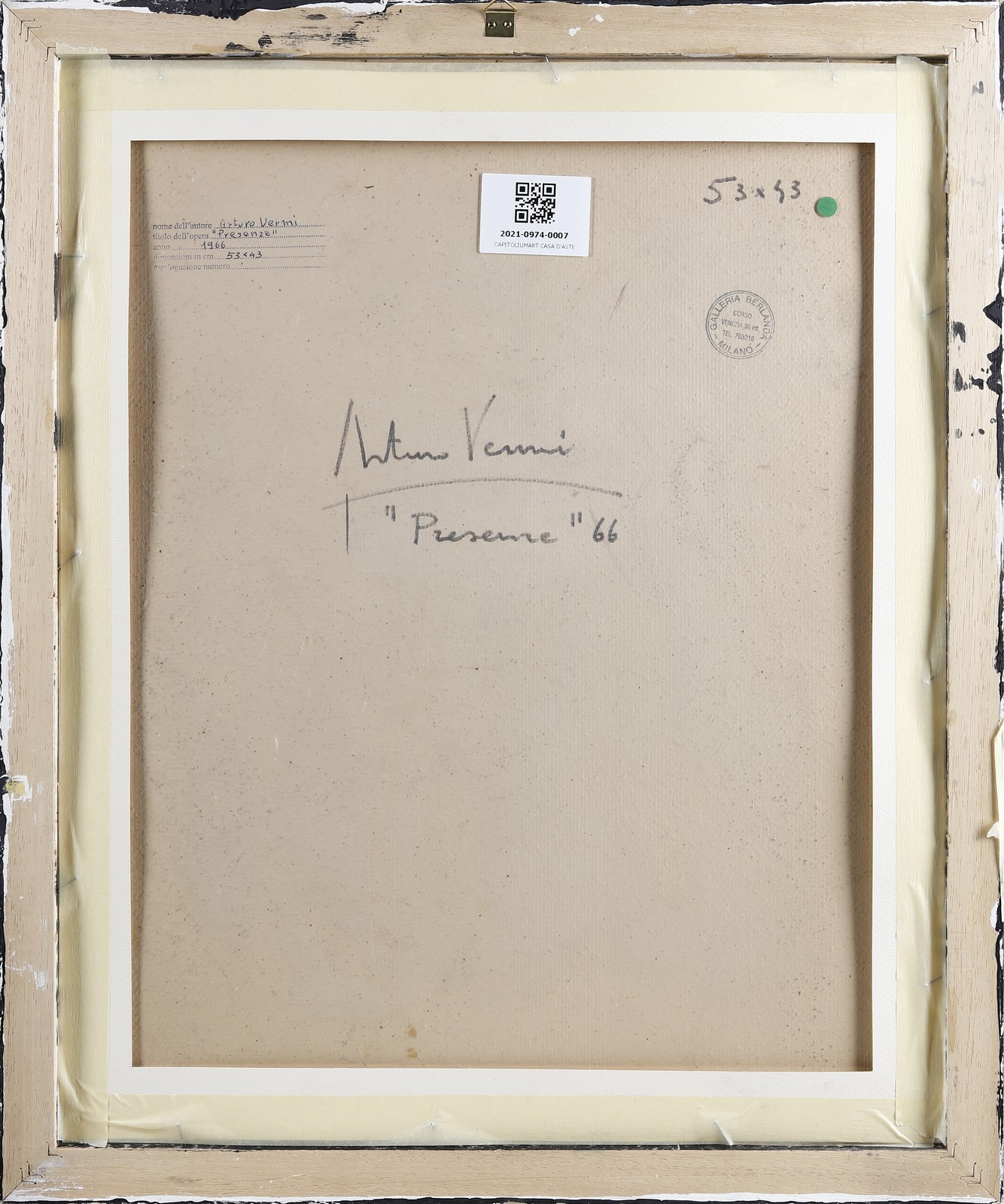 VERMI ARTURO (1928 - 1988) Presenze. 1966. Acrilico su carta. Cm 43,00 x 53,00. Al retro titolo, firma, anno e timbro Galleria Berlanda, Milano. Cornice presente