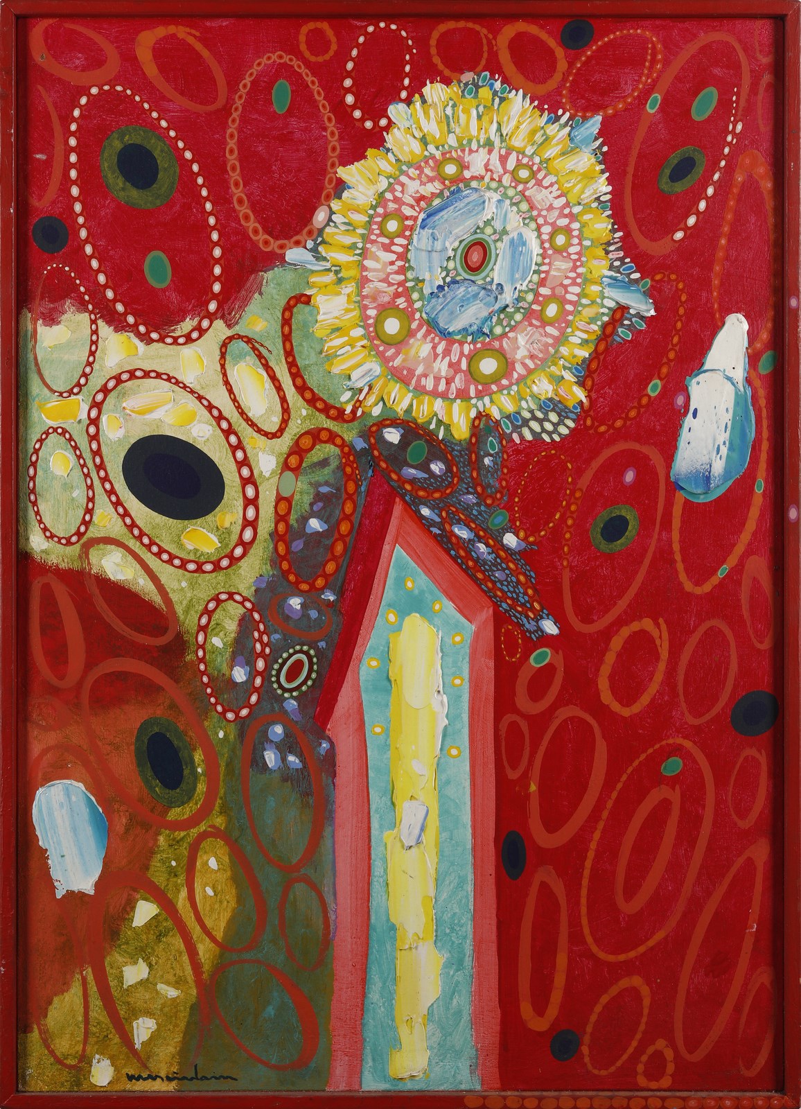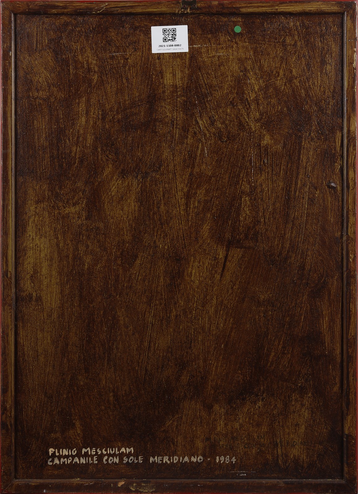 MESCIULAM PLINIO (n. 1926) Campanile con sole meridiano. 1984. Acrilico su tavola. Cm 52,00 x 71,00. Firma in basso a sinistra. Al retro nome, titolo, data. Cornice presente