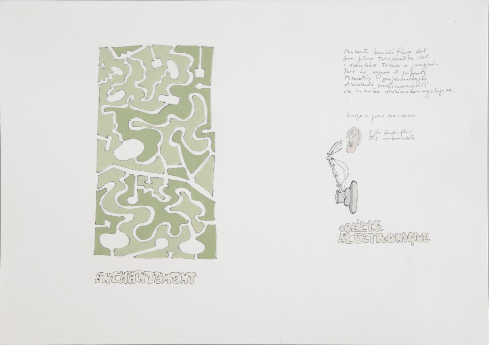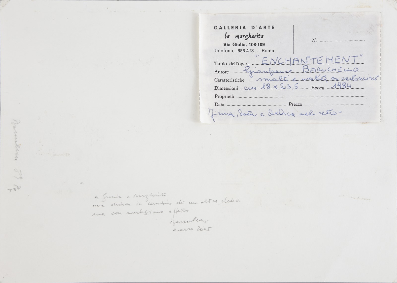 BARUCHELLO GIANFRANCO (n. 1924) Enchantement. 1984. Tecnica mista su carta. Cm 23,50 x 18,00. Al retro firma, anno, dedica e cartiglio descrittivo Galleria La Margherita, Roma. Opera archiviata presso la Fondazione Gianfranco Baruchello, Roma. . Cornice presente