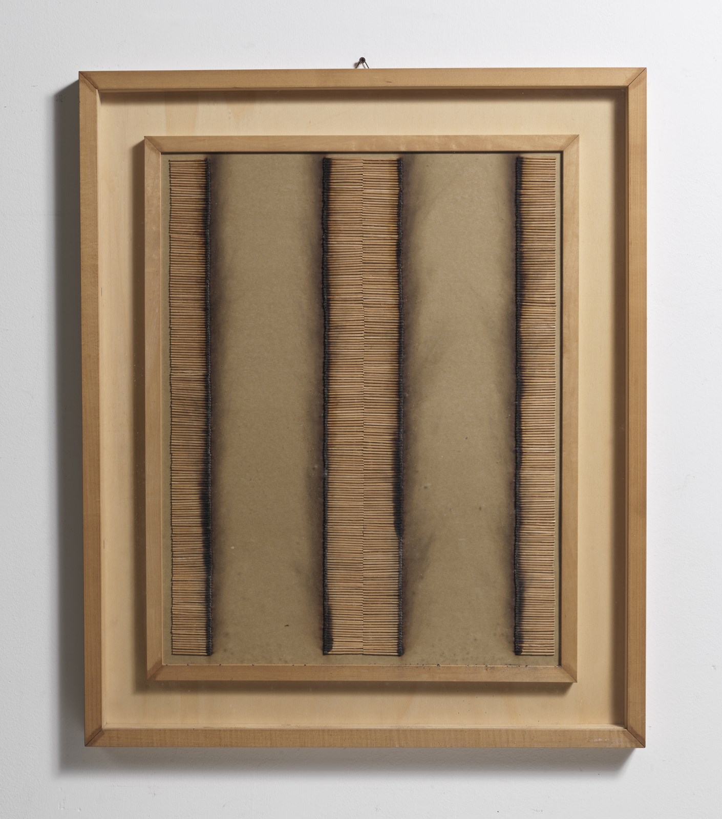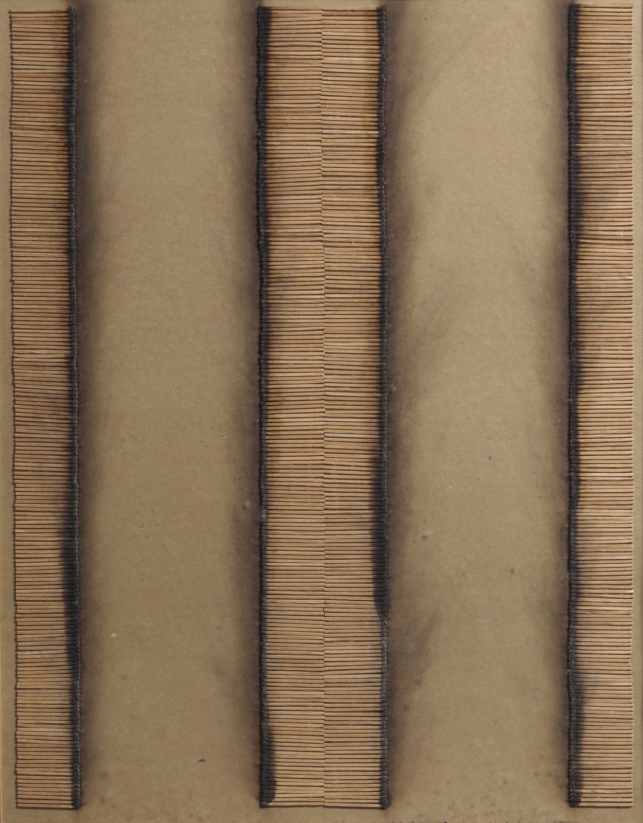 AUBERTIN BERNARD (1934 - 2015) Parcours d'allumettes. 1974. Fiammiferi bruciati su carta. Cm 50,50 x 63,50. Al retro cartiglio Galleria Centro, Brescia con firma, titolo e anno. Opera archiviata presso l'Archivio Bernard Aubertin, Brescia. Cornice presente