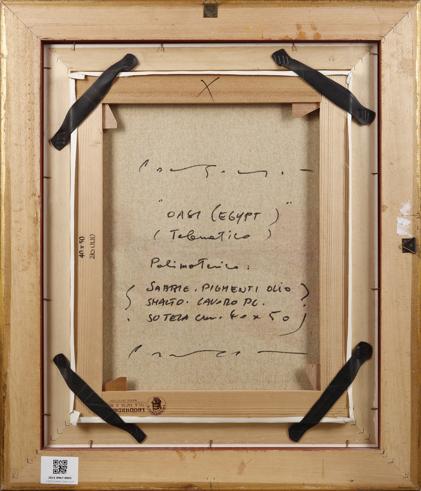 PAGLIACCI MIRKO (n. 1959) Oasi (Egypt). Tecnica mista su tela. Cm 40,00 x 50,00. Al retro firma e titolo. Cornice presente