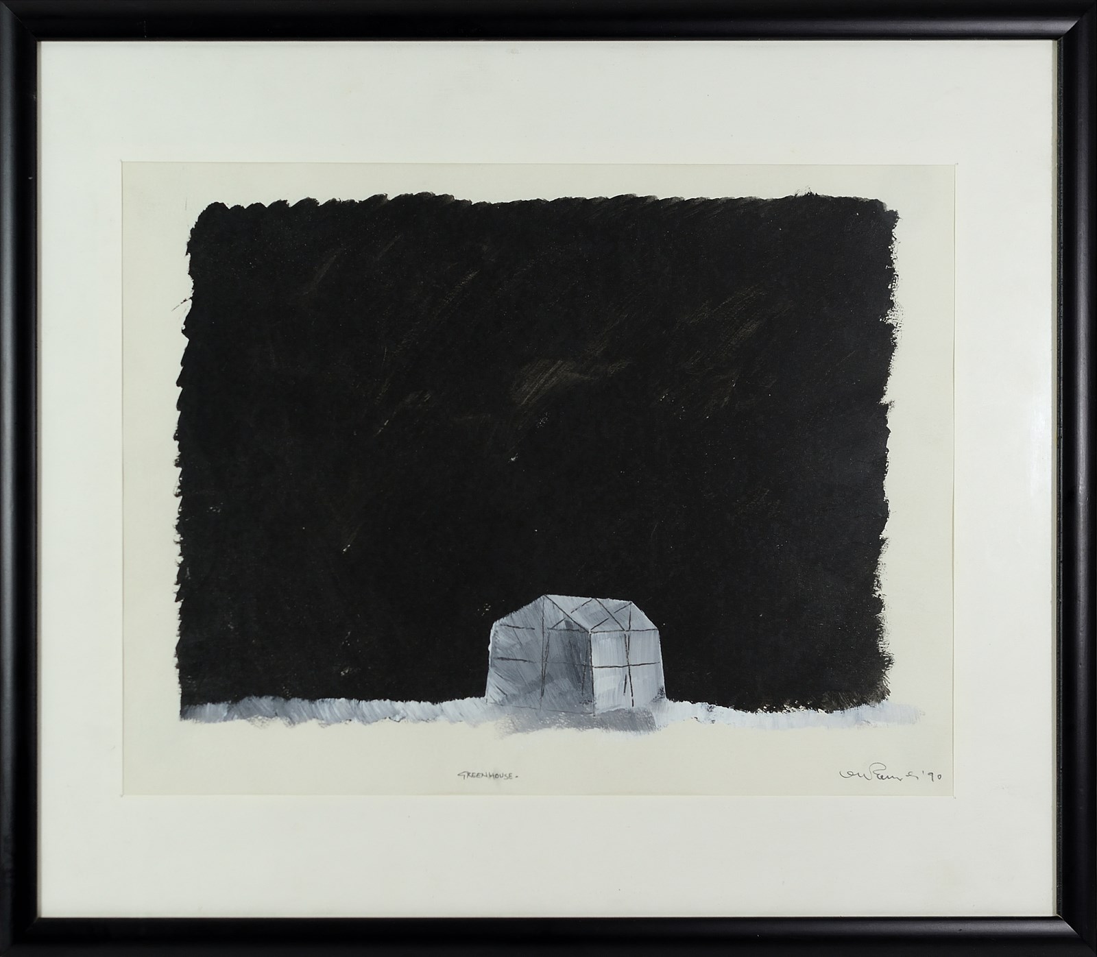 POMPILI GRAZIANO (n. 1943) Greenhouse. 1990. Gouache su carta. Cm 40,00 x 28,00. Titolo e firma in basso. Cornice presente