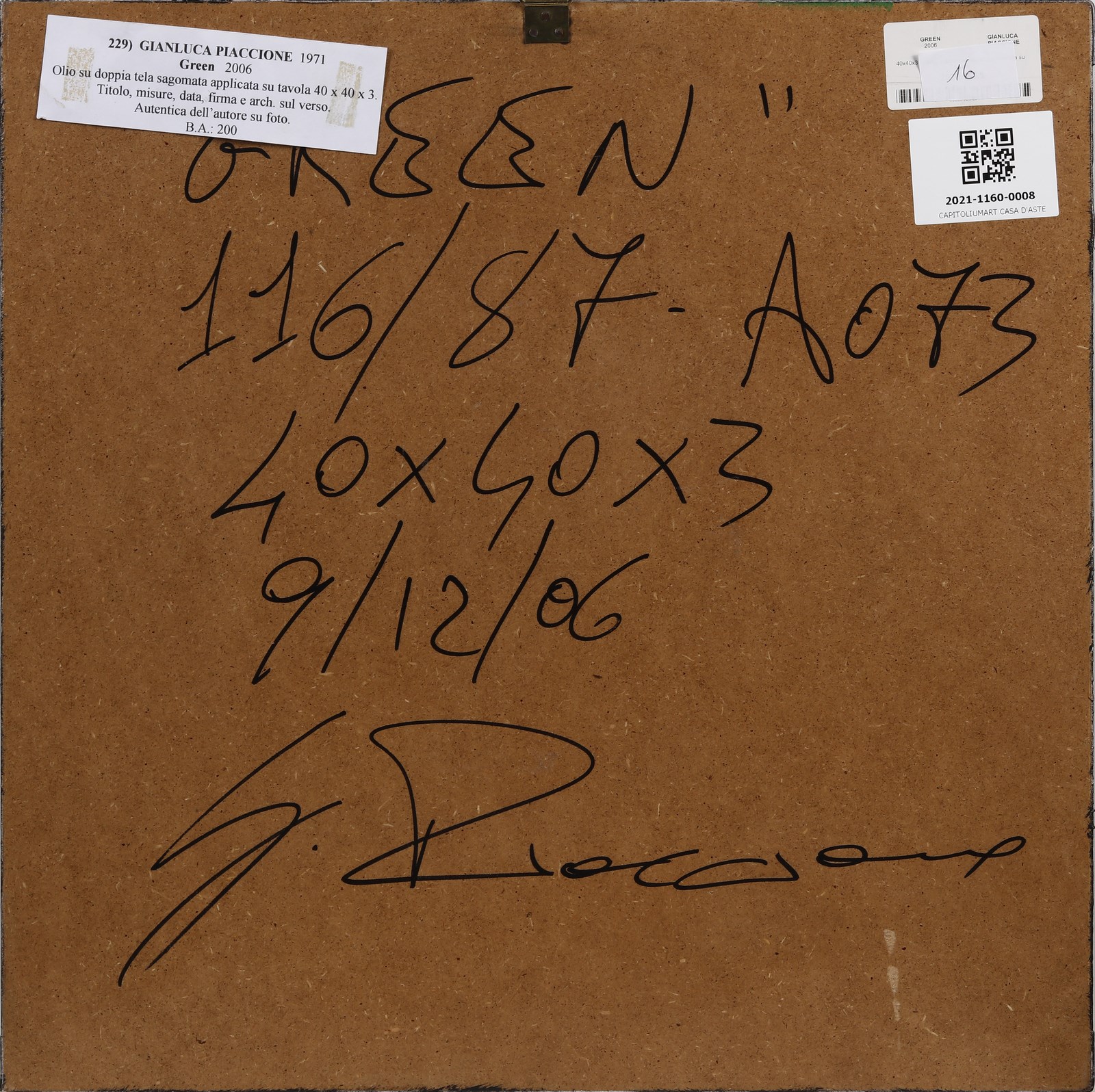 PIACCIONE GIANLUCA (n. 1971) Green. 2006. Olio su tela incollata su tavola. Cm 40,00 x 40,00. Firma al retro.