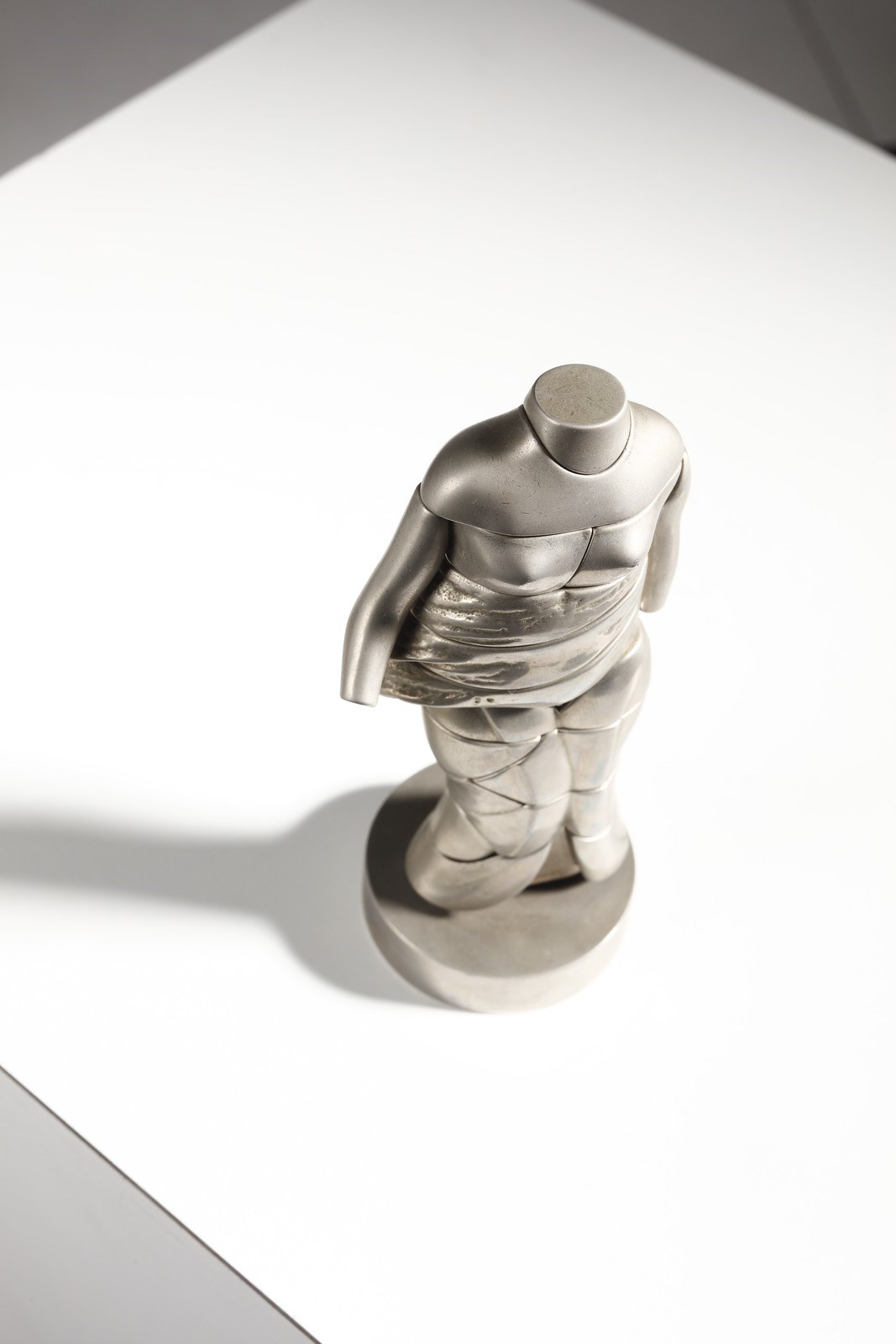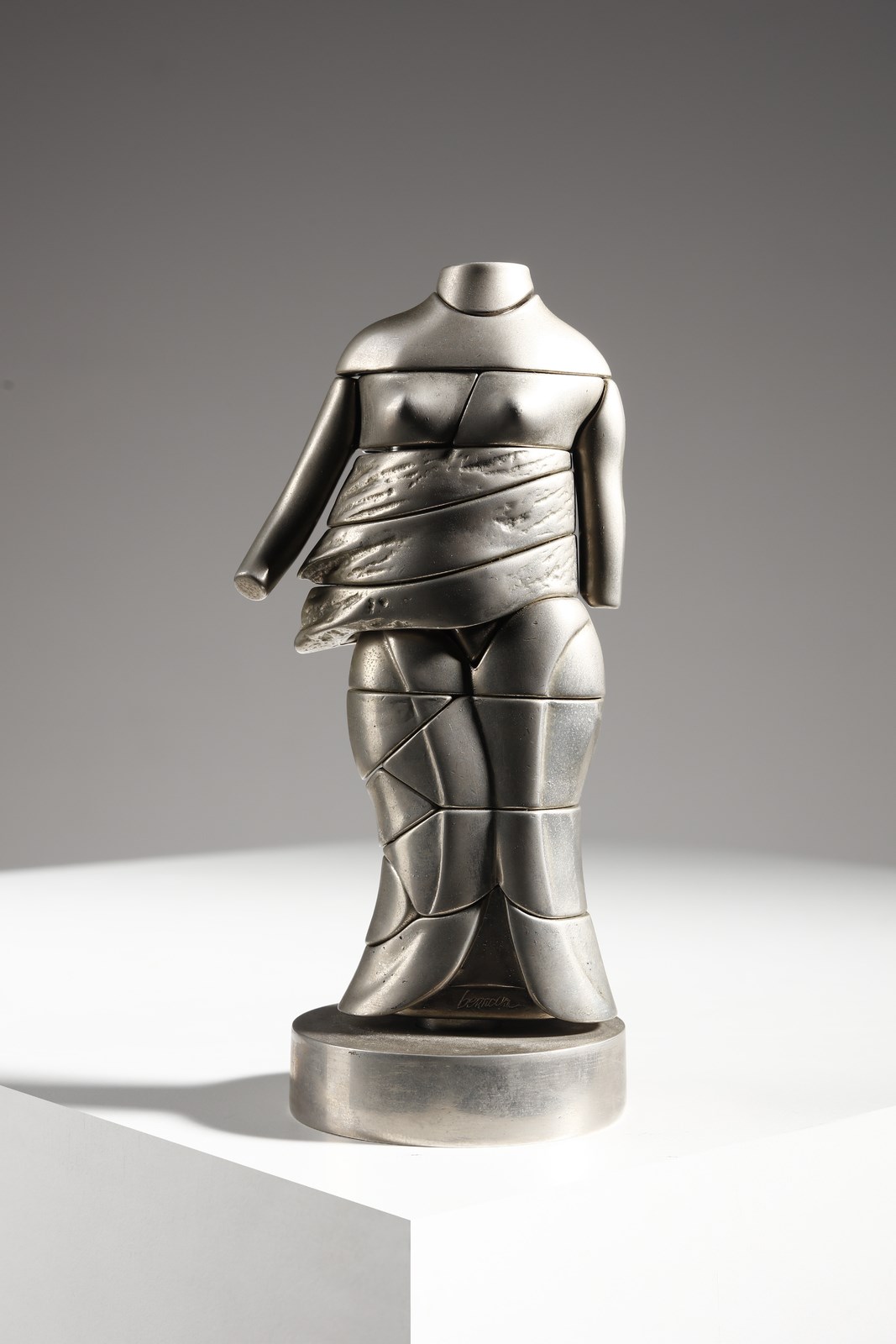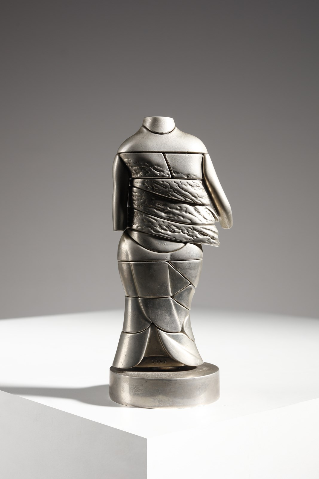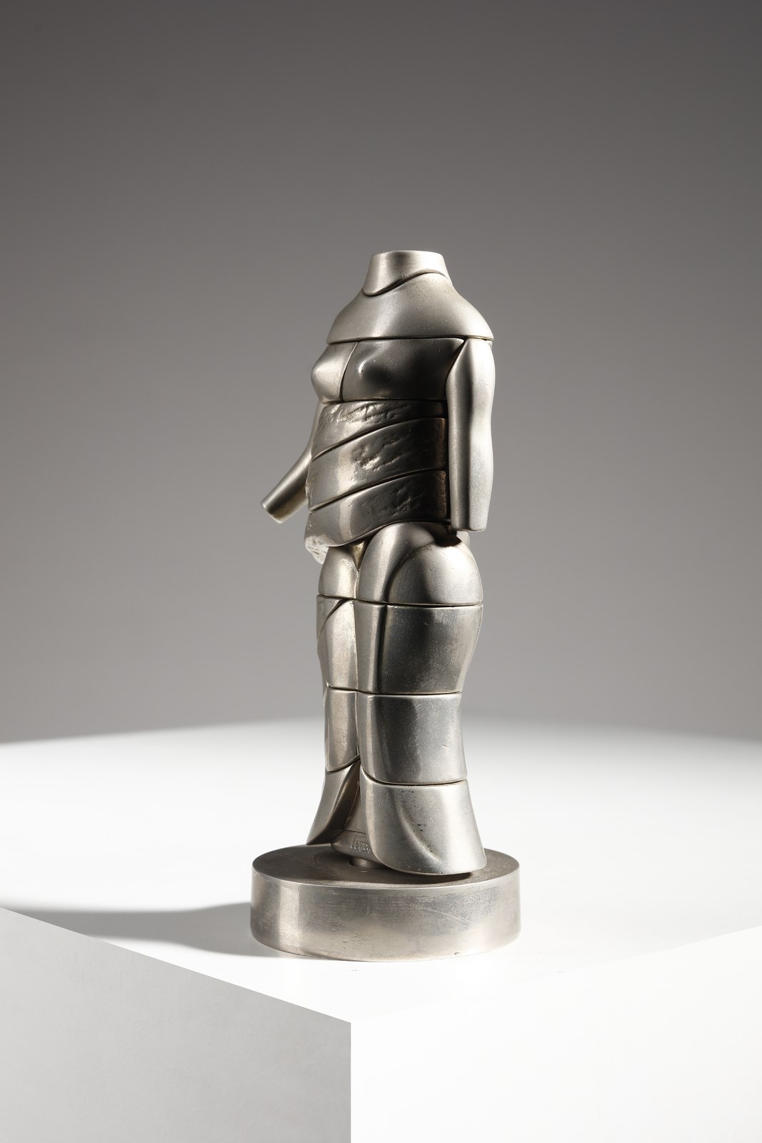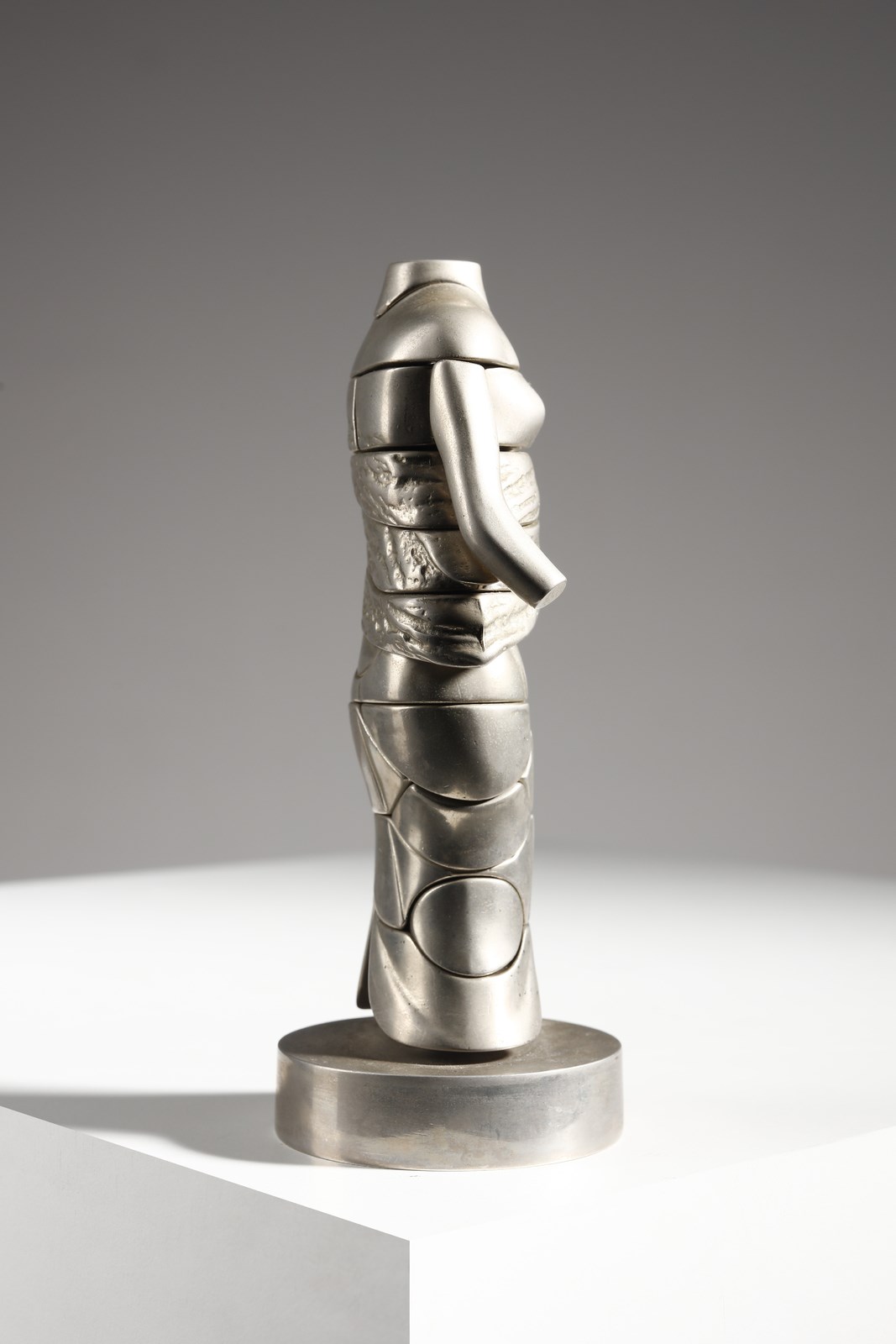 BERROCAL MIGUEL ORTIZ (1933 - 2006) La mini Cariatide. Scultura. Cm 15,00. 1968 1969. Es. 4150. Dalla serie Micro - Multiples: scultura smontabile composta da 24 elementi, uno dei quali è un anello cuore. Le copie della scultura, al di fuori di quelle realizzate in oror e in argento, sono state realizzate ad iniezione. Edizione totale: 6 esemplari in oro fino a 18k firmati con un punzone speciale e numerati da I a VI e muniti del certificato di autenticità; 500 esemplari in argento massiccio relizzati per Orangerie Multiples di Cologna, firmati e numerati da 1 a 500; 9500 esempalri in metallo cromato firmati e numerati da 501 a 10000 + edizione illimitata di esemplari in materia plastica ( anello non presente, quindi elementi della scultura sono 23).