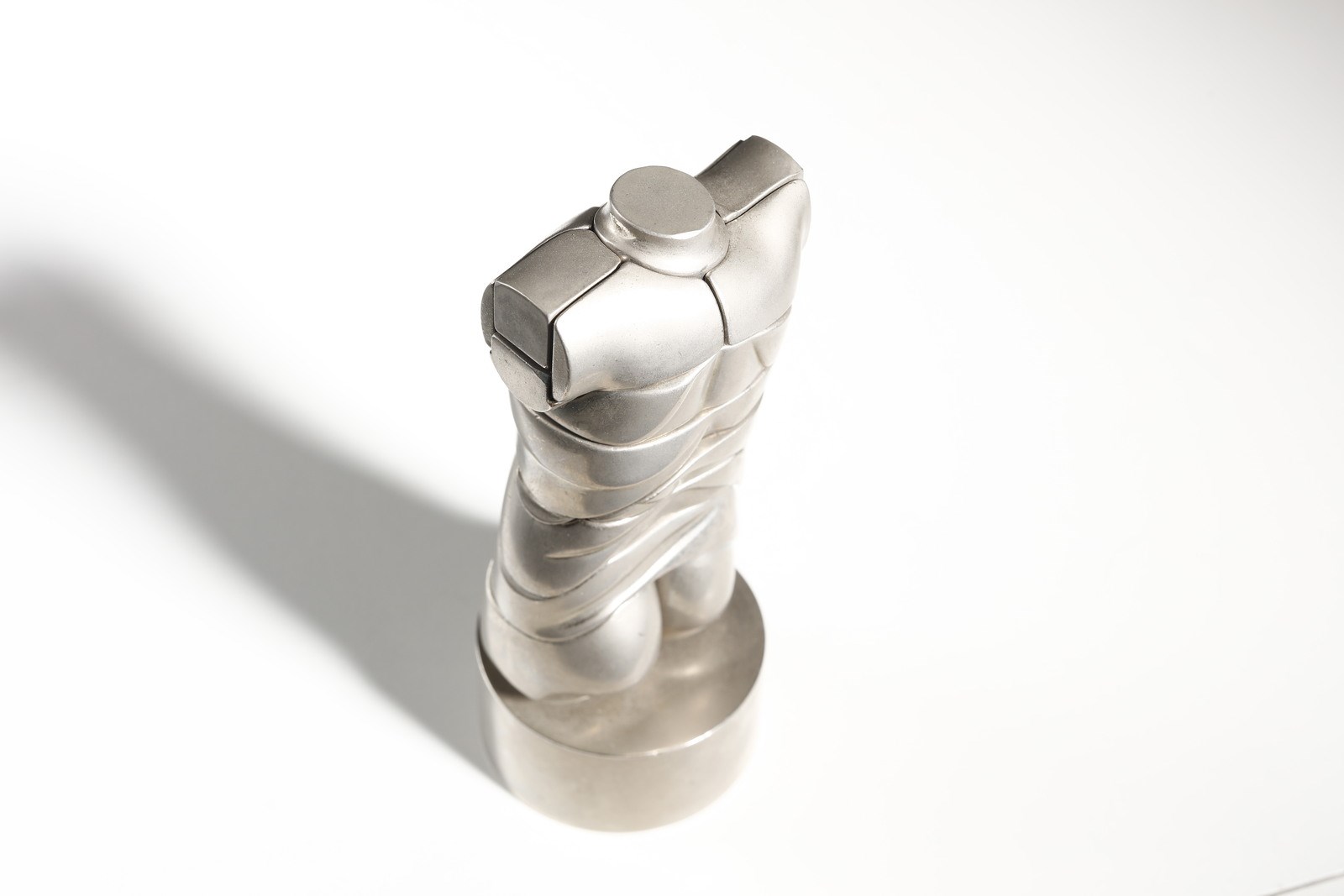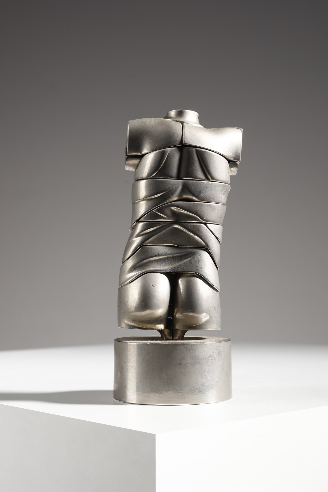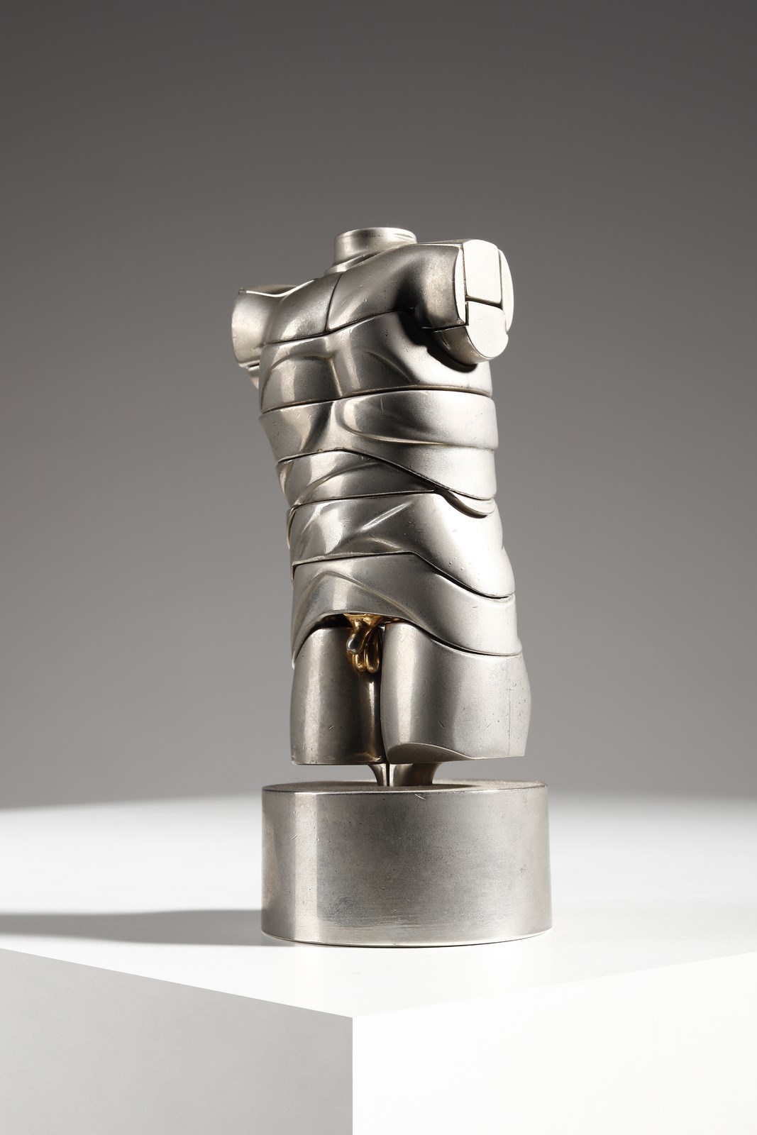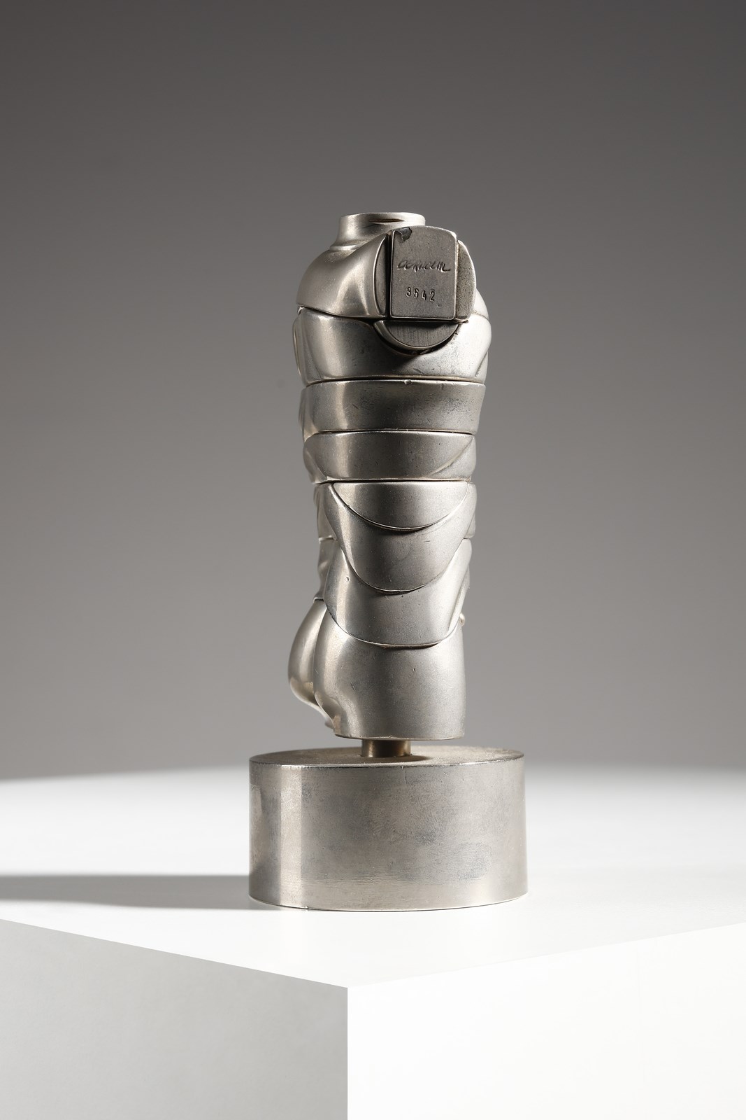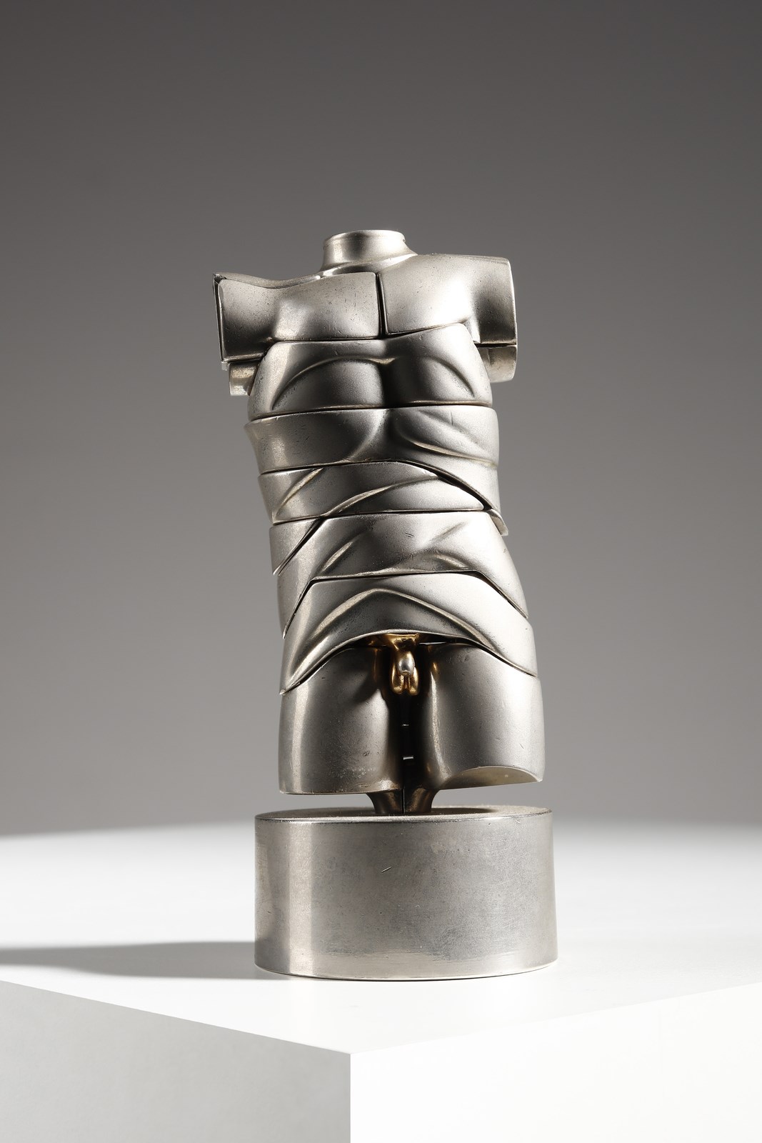 BERROCAL MIGUEL ORTIZ (1933 - 2006) Mini - Davide. 1968. Scultura. Cm 5,40 x 14,00. 3642/9500. Dalla serie Micro - multiples: scultura smontabile composta da 22 elementi, uno dei quali è un anello. Dimensioni senza base: 10x5.4x3.6 cm. Edizione totale: 6 esemplari in oro fino a 18k ; firmati ( con un timbro speciale per le opere in oro) e numerati da I a VI. 500 esemplari in lega di alluminio, placcati in oro con una gemma di lapislazzuli nell'anello, relizzati per le Edizioni " Le Soleil Noir", Parigi. 9500 esemplari in lega d'alluminio nichelati, l'anello ha una gemma in agata verde, le sculture sono firmate e numerate + Edizione in resina sintetica in cui l'anello è sostituito da un elemento differente.