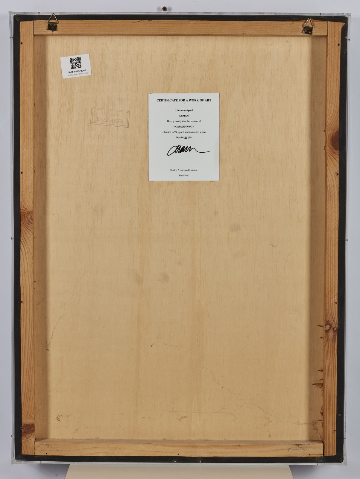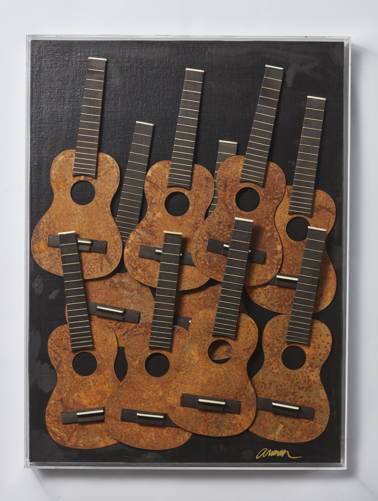ARMAN FERNANDEZ (1928 - 2005) Cavaquinho. 2003. Multiplo. Cm 60,00 x 81,00. 25/99. Firma in basso a destra. Al retro cartiglio descrittivo con firma e tiratura. Applicazione di legni e metalli su tela riportati su tavola entro teca di plexiglass. Cornice presente