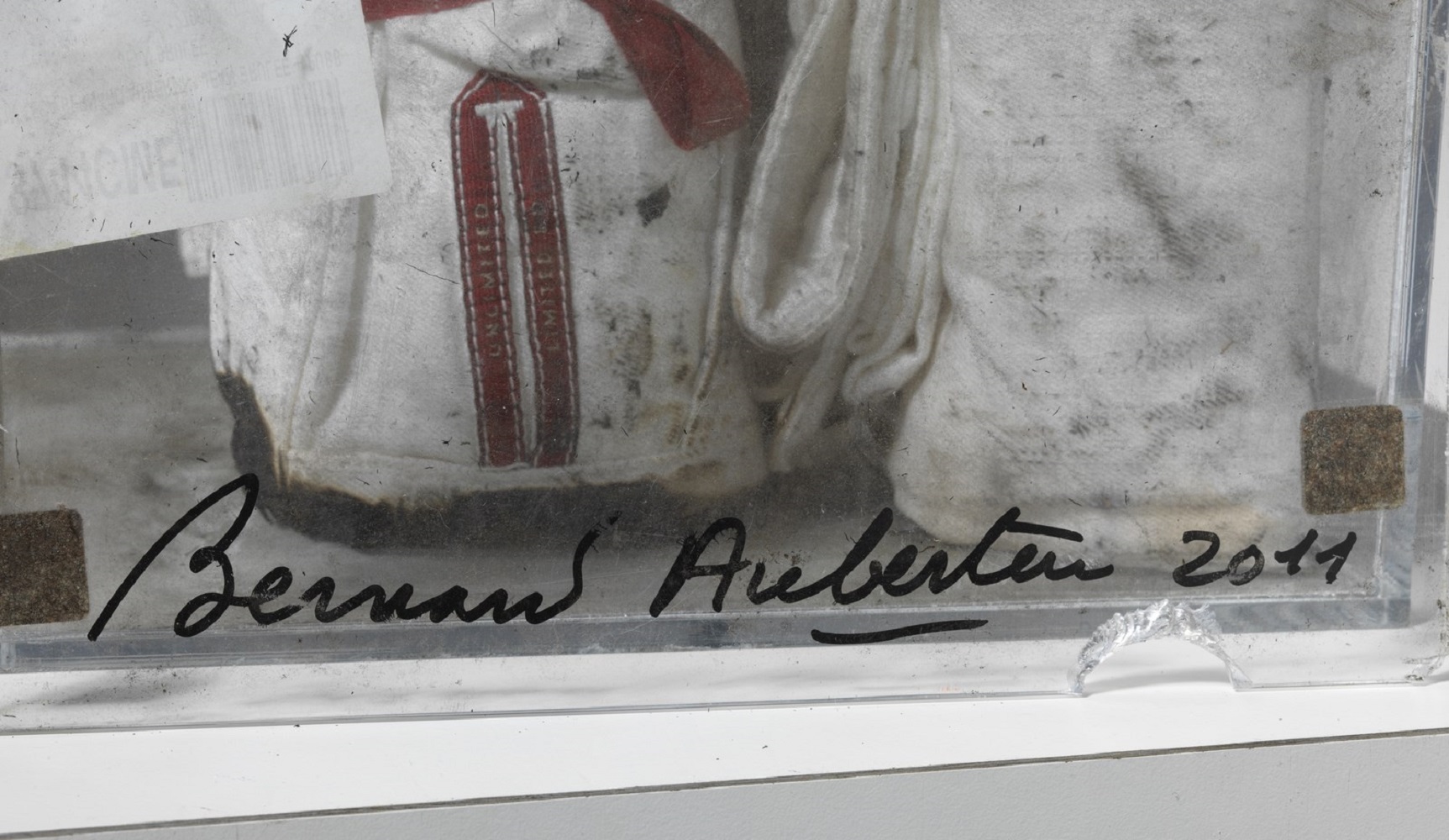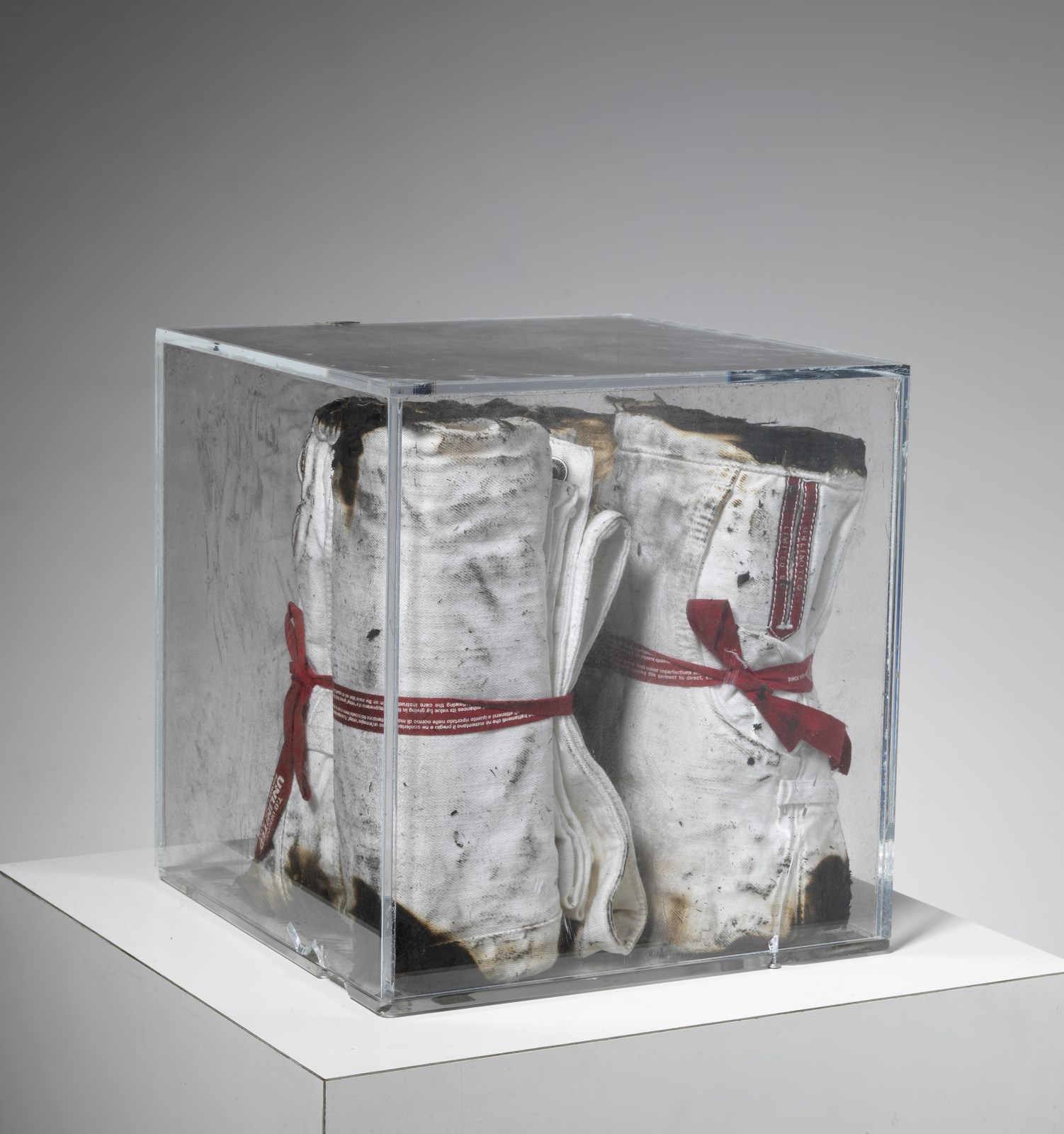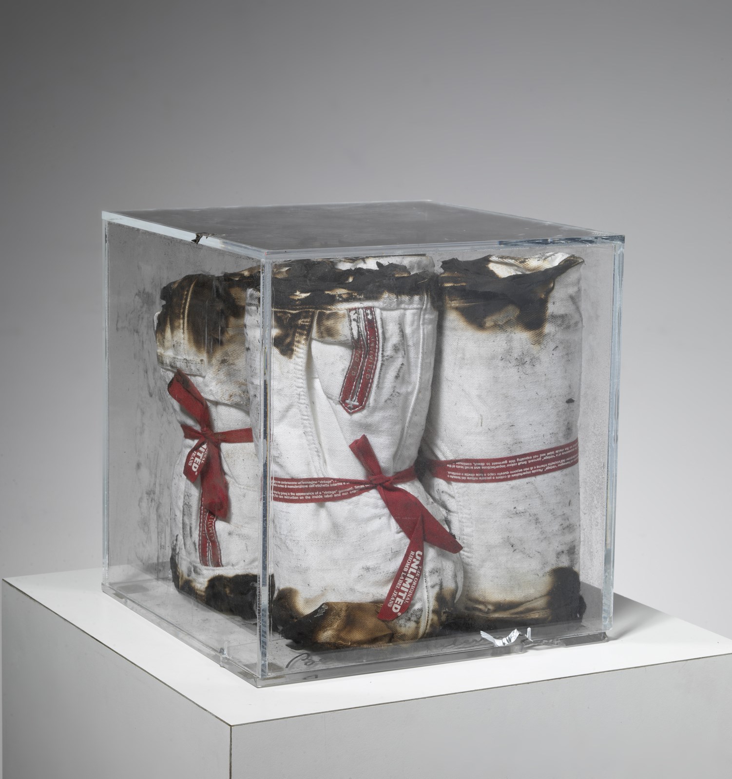 AUBERTIN BERNARD (1934 - 2015) Jeans Bruciati. 2011. Scultura. Cm 27,00 x 27,00 x 27,00. Esemplare unico. Firma e anno sopra il plexiglass. Opera archiviata presso l'Archivio Bernard Aubertin, Brescia, come da documentazione fotografica allegata all'opera riportante il relativo numero d'inventario. Pubblicazione: Bernard Aubertin Unlimited, Maretti Editore, Giugno 2011, pag. 146. Difetti.