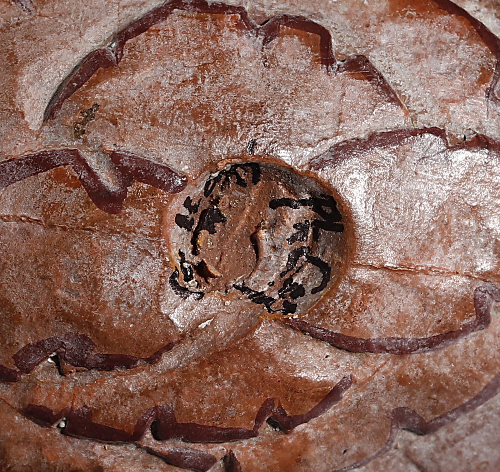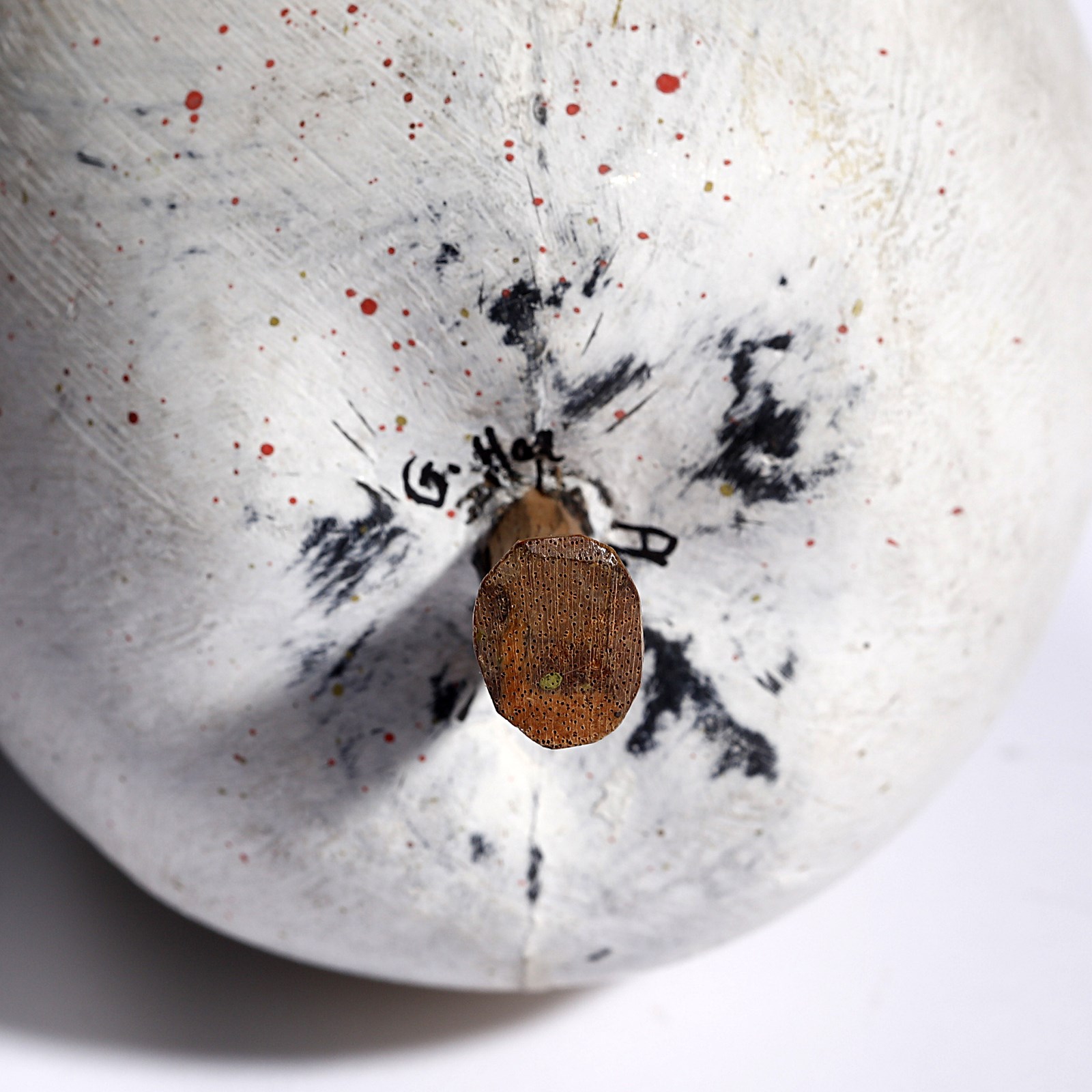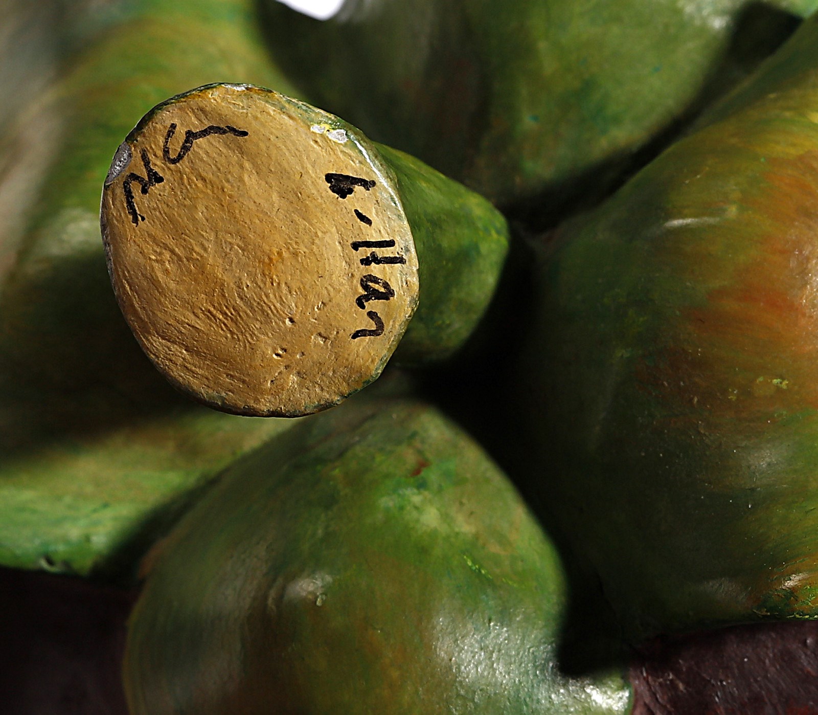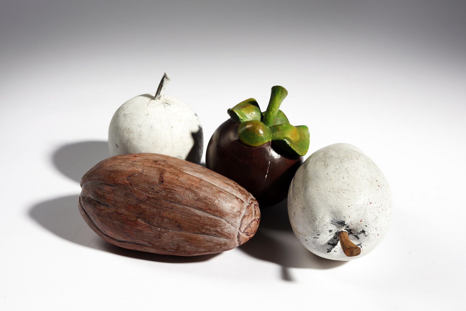 CORNER PHILIP (n. 1933) Kalapa Klappers. Legno dipinto.. Cm 16,00. Lotto composto da n.4 frutti. Ogni pezzo è firmato. Lievi difetti.