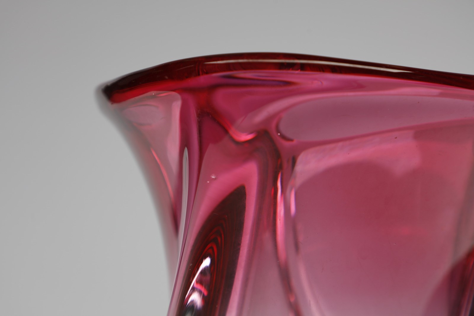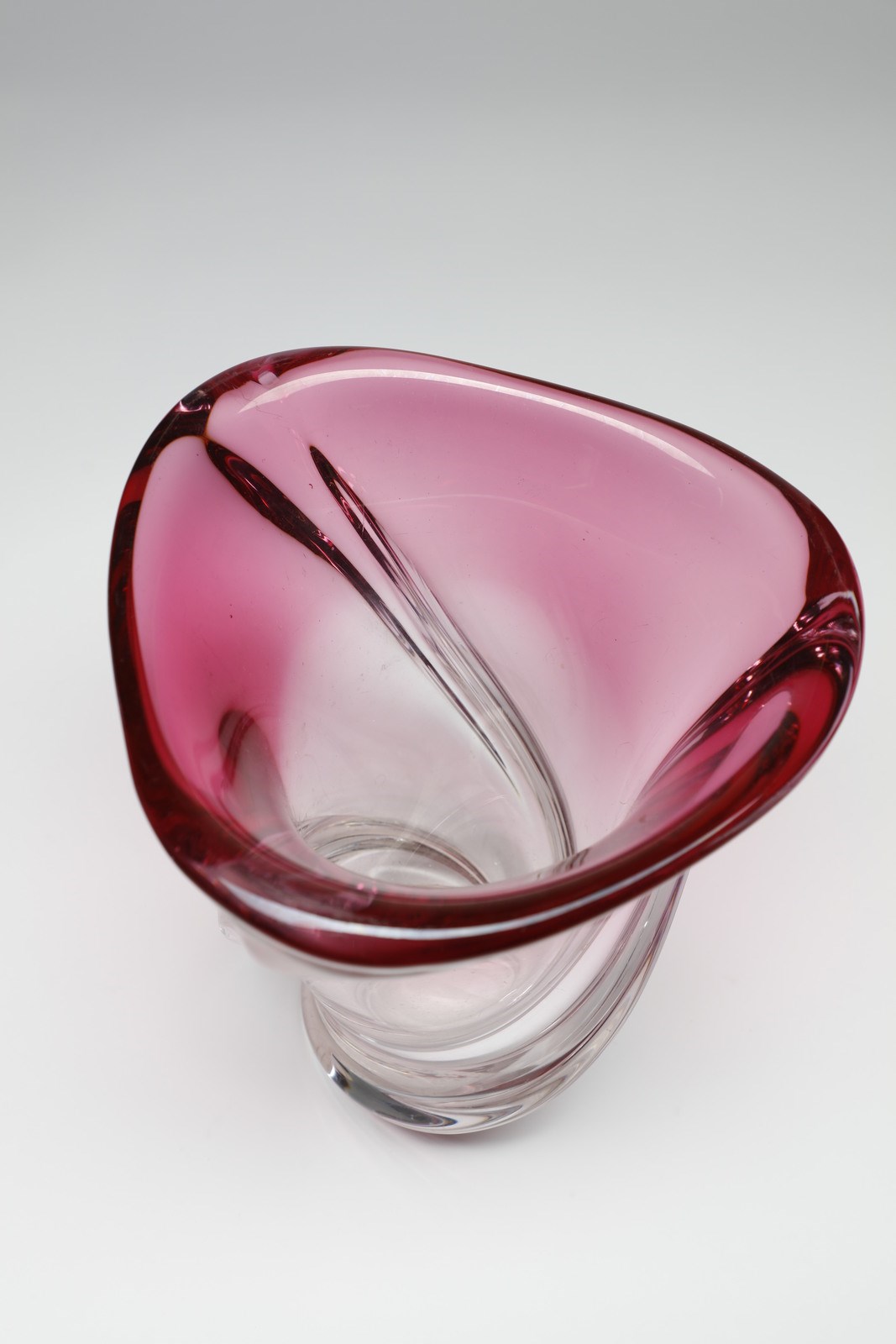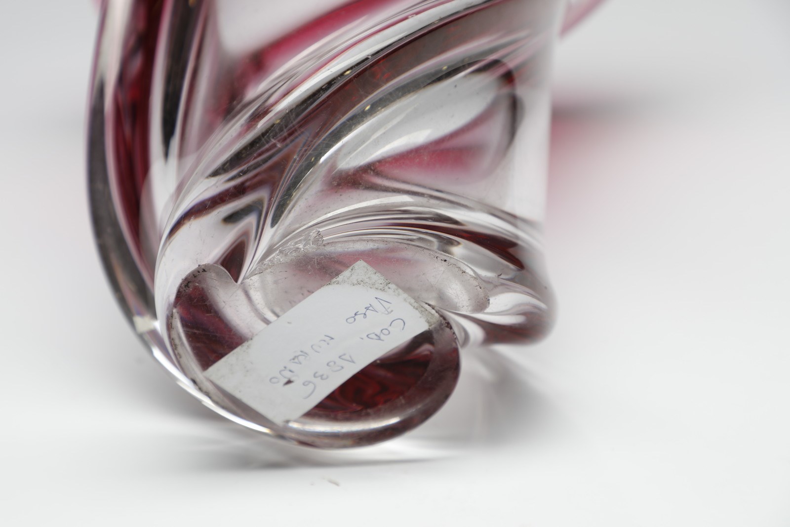VAL SAINT LAMBERT Vaso in vetro trasparente sfumato rubino decorato a costolature. Vetro belga.. Cm 23,00 x 27,00 x 23,00. anni Sessanta.