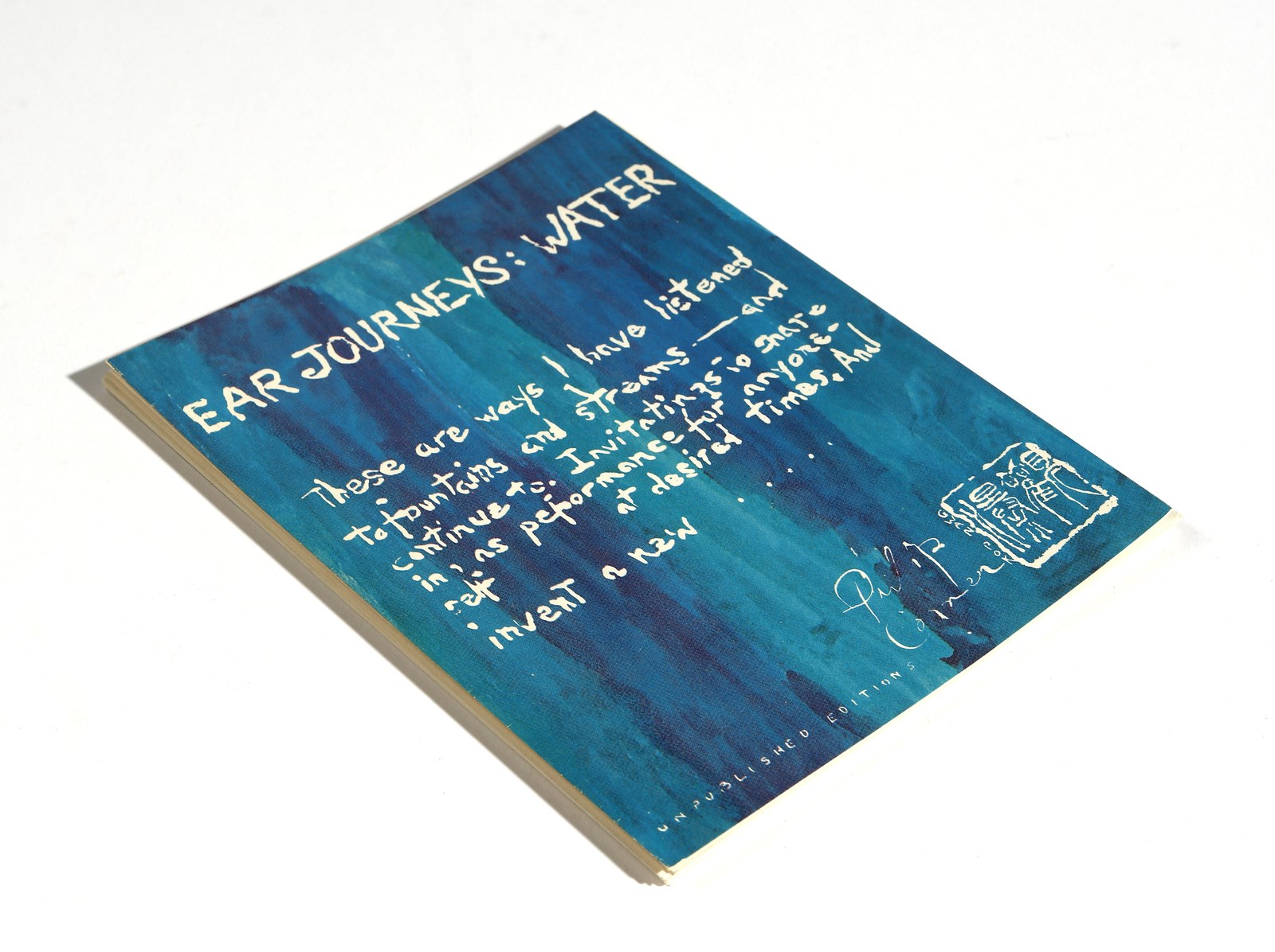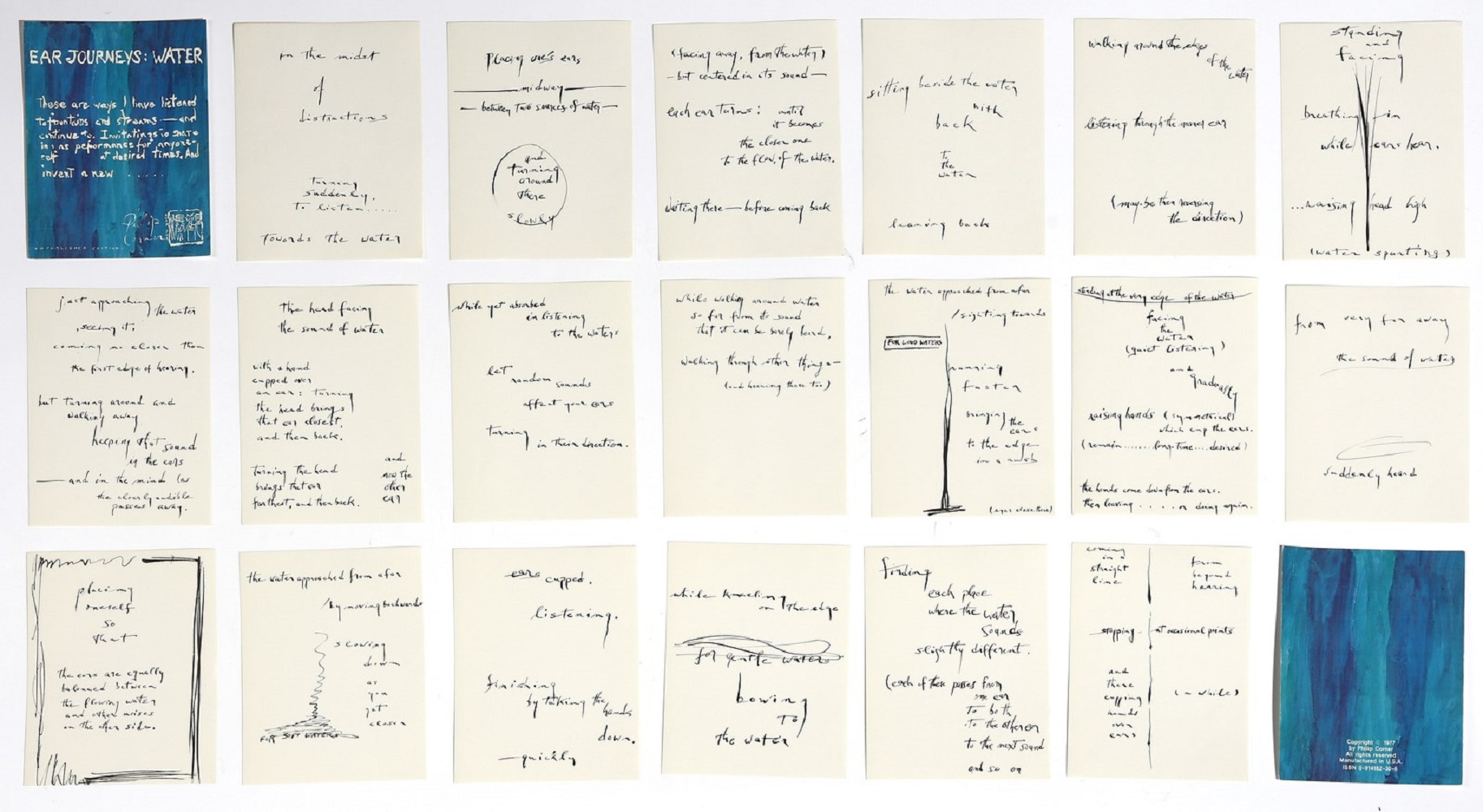 CORNER PHILIP (n. 1933) Ear journeys: water. 1977. stampa su cartone. Cm 13,00 x 18,00. Unpublished Editions, New York. Serie di 19 pagine di poesie. Pezzo di pelle secca mancante. Entro contenitore i plexiglass.