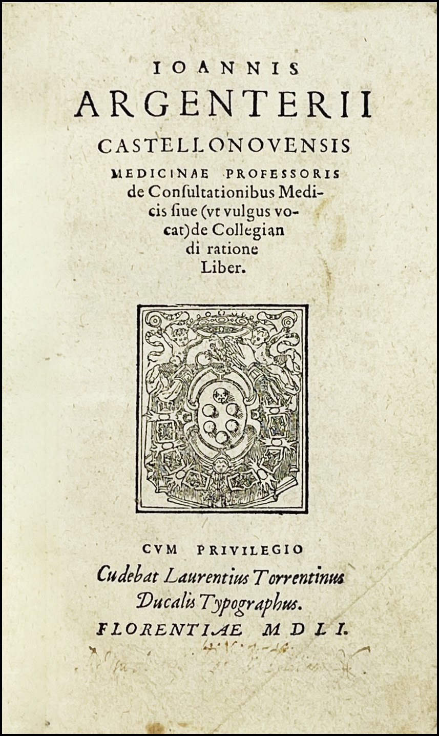 ARGENTERIO, GIOVANNI. Ioannis Argenterii Castellonouensis ... De consultationibus medicis siue (vt vulgus vocat) de collegiandi ratione liber. Florentiae : cudebat Laurentius Torrentinus ducalis typographus, 1551.
