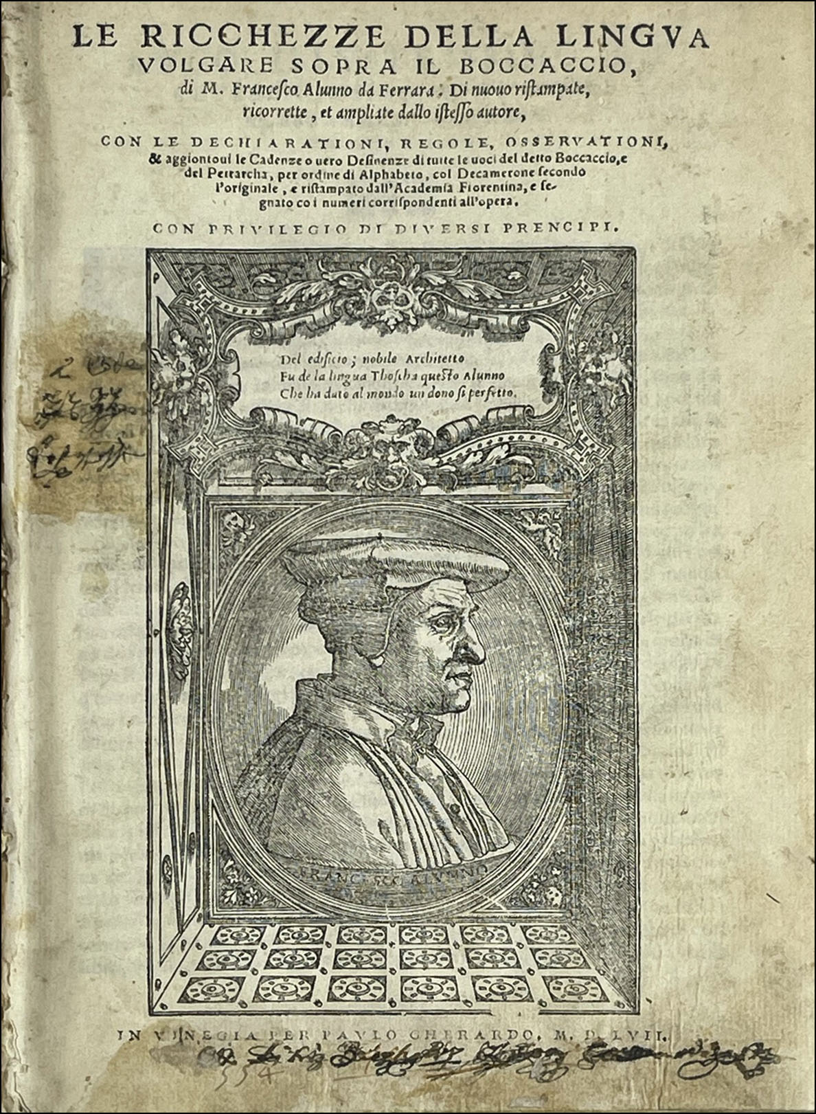 Alunno, Francesco. Le ricchezze della lingua volgare sopra il Boccaccio, di M. Francesco Alunno da Ferrara. Di nuouo ristampate, ricorrette et ampliate dallo istesso autore, con le dechiarationi, regole, osseruationi, & aggiontoui le Cadenze o uero Desinenze di tutte le uoci del detto Boccaccio, , e del Petrarca, per ordine di Alphabeto, col Decamerone secondo l'originale, e ristampato dall'Accademia Fiorentina, e segnato co i numeri corrispondenti all'opera con privilegio di diversi prencipi. In Vinegia : per Paulo Gherardo (at colophon per Comin da Trino), 1557.