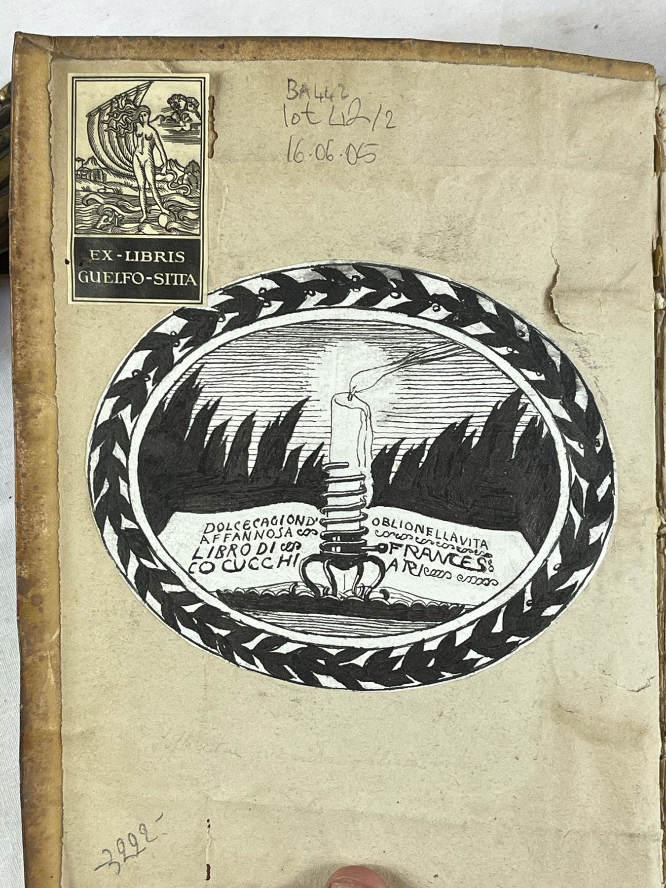Provenance: Ex Libris Guelfo-Sitta and Dolce cagion di oblio nella vita Affannosa di Francesco Cucchiari pasted at front inside board.