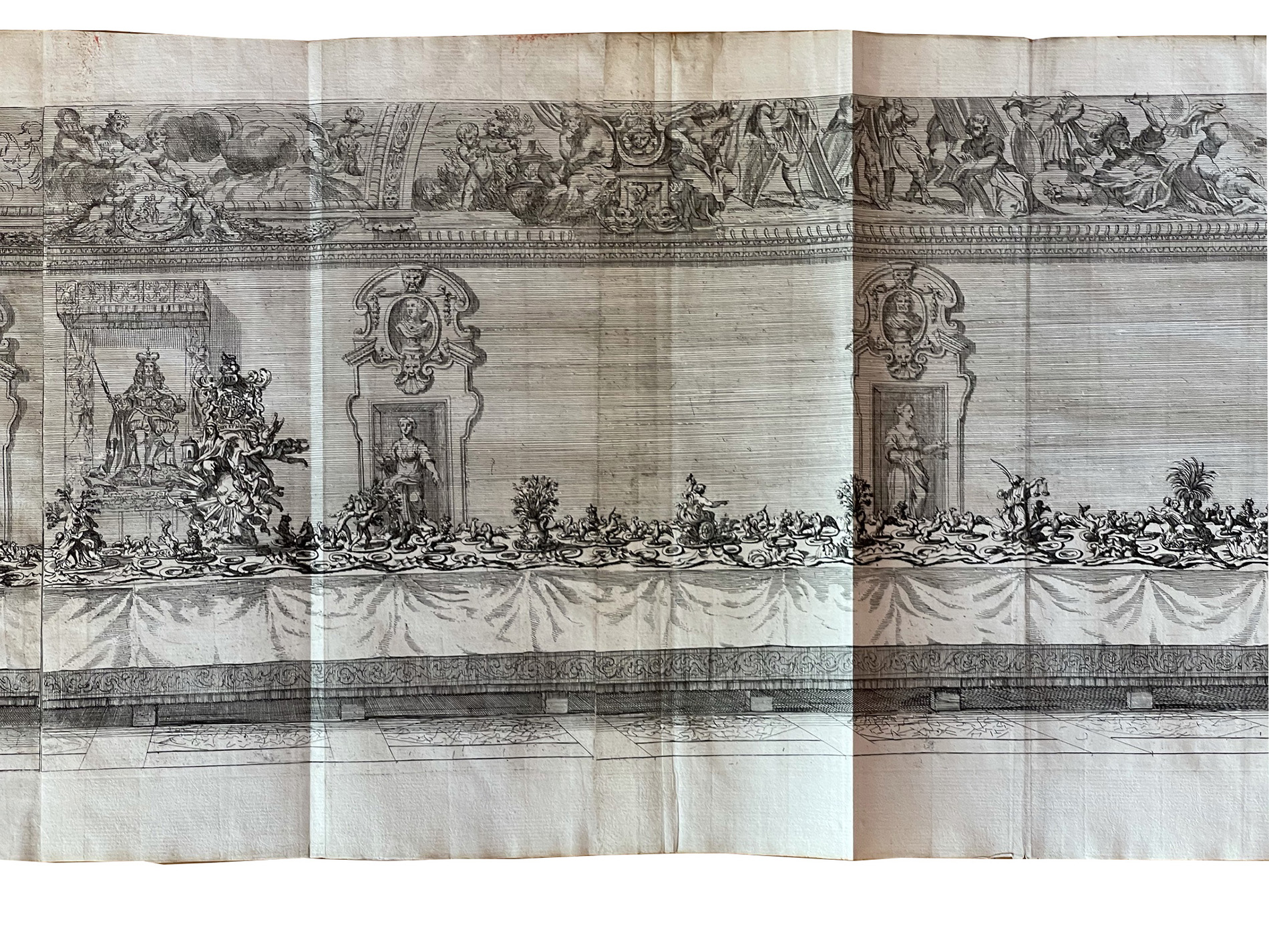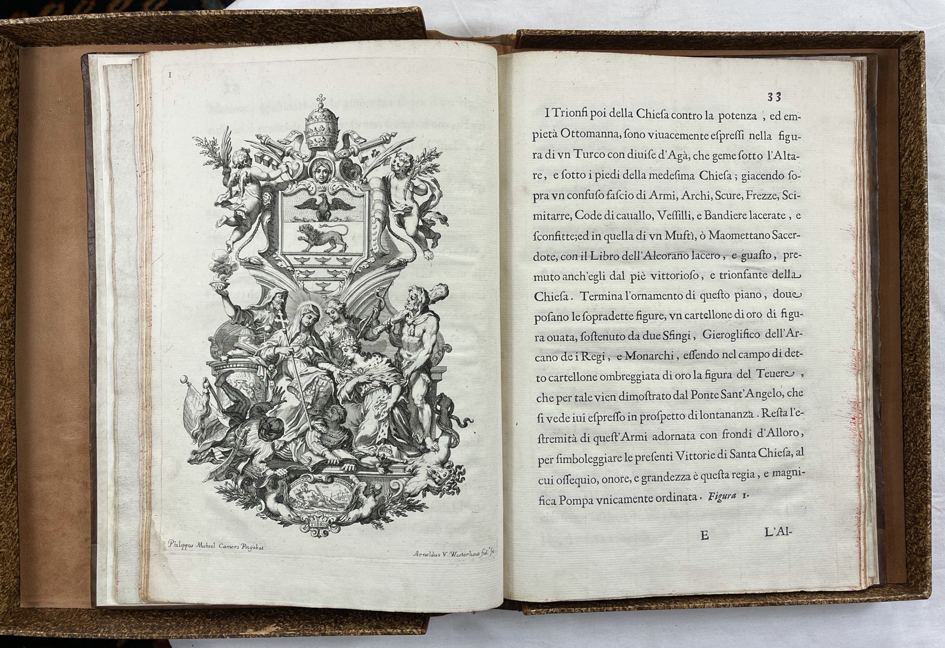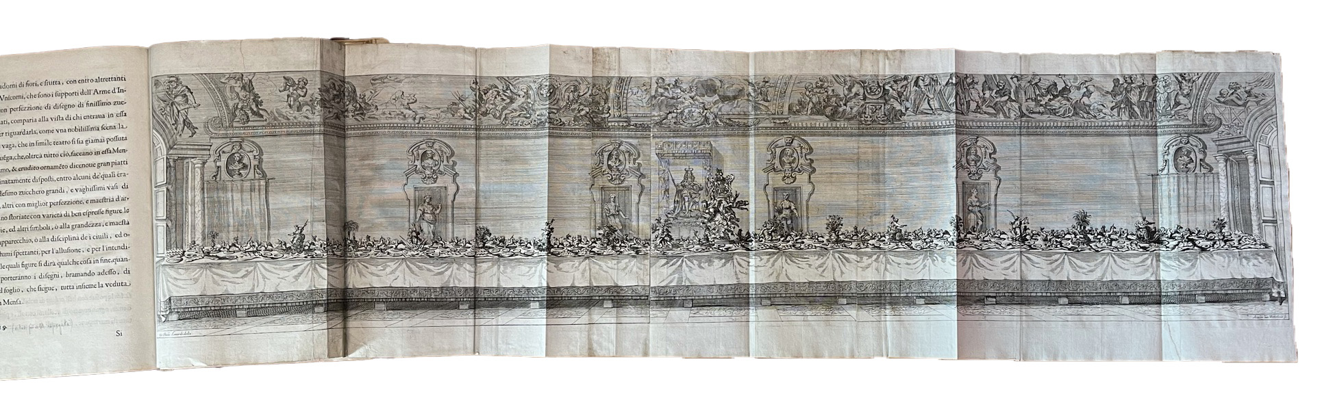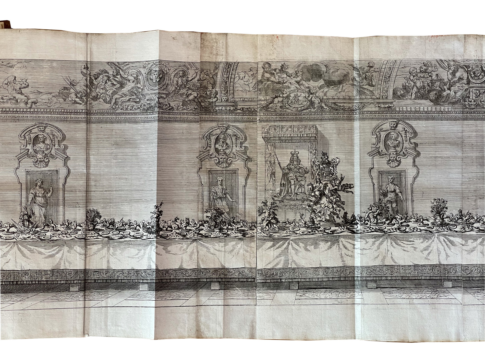 Sumptuous Festival book relating to the reception in the Vatican in 1687 of the British ambassador Castelmaine, accompanied by the painter J.M. Wright, author of the present work. The folded table, over a meter long, illustrates the setting up of the banquet in a frescoed room.
