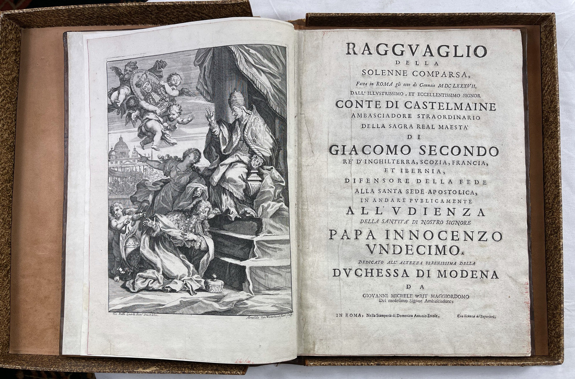 Wright, John Michael. Ragguaglio della solenne comparsa, fatta in Roma gli otto di Gennaio MDCLXXXVII. dall'Illustrissimo, et Eccellentissimo Signor Conte di Castelmaine, Ambasciatore Straordinario della Sagra Maesta di Giacomo Secondo Re d'Inghilterra, Scozia, Francia, et Ibernia, difensore della fede alla Santa Sede Apostolica, in andare publicamente all'udienza della santita di nostro Signore Papa Innocenzo Undecimo. / Dedicato all'Altezza Serenissima . della Duchessa di Modena da Giovanni Michele Writ maggiordomo del medesimo ambasciatore . Roma : nella Stamperia di Domenico Antonio Ercole, [1687].