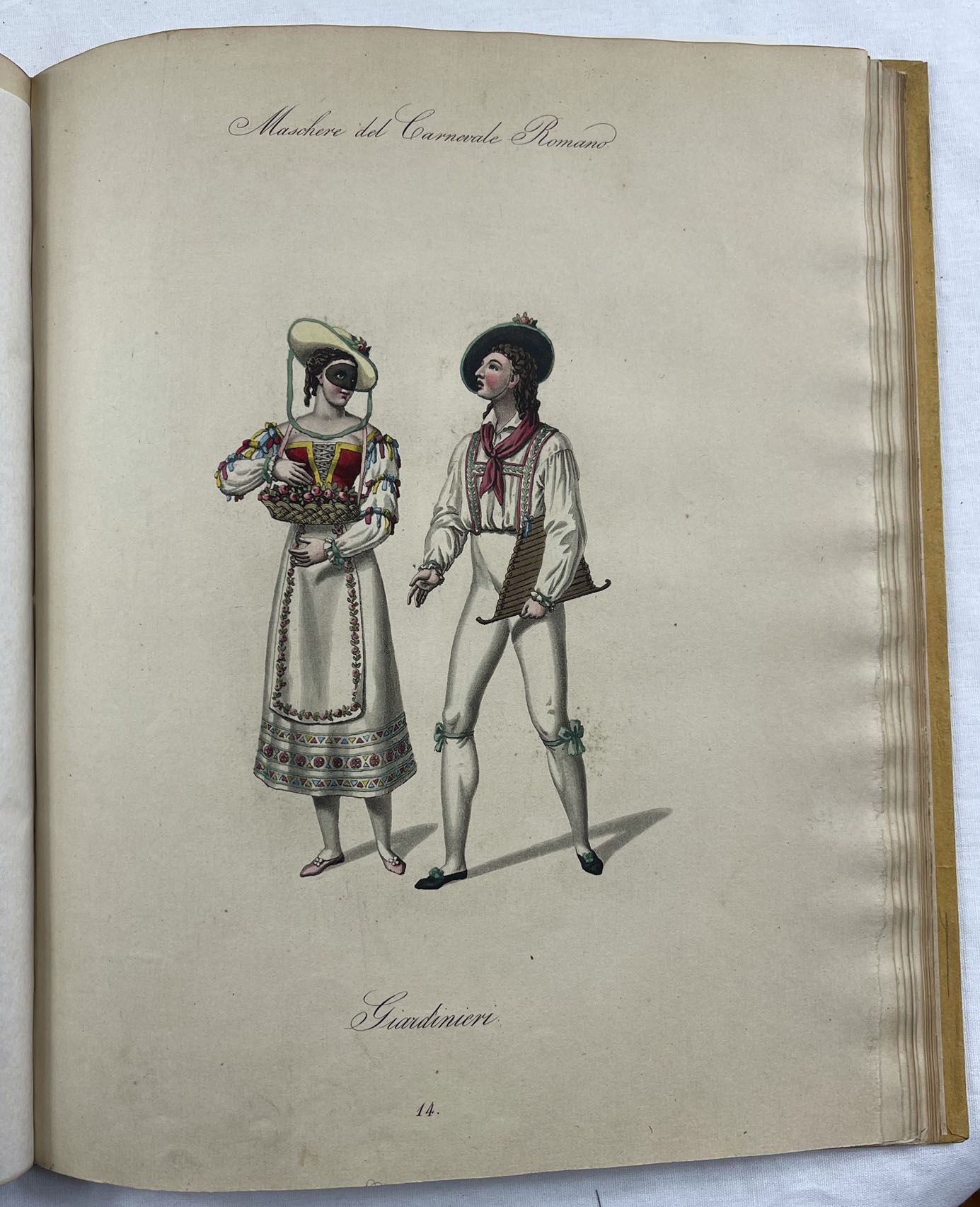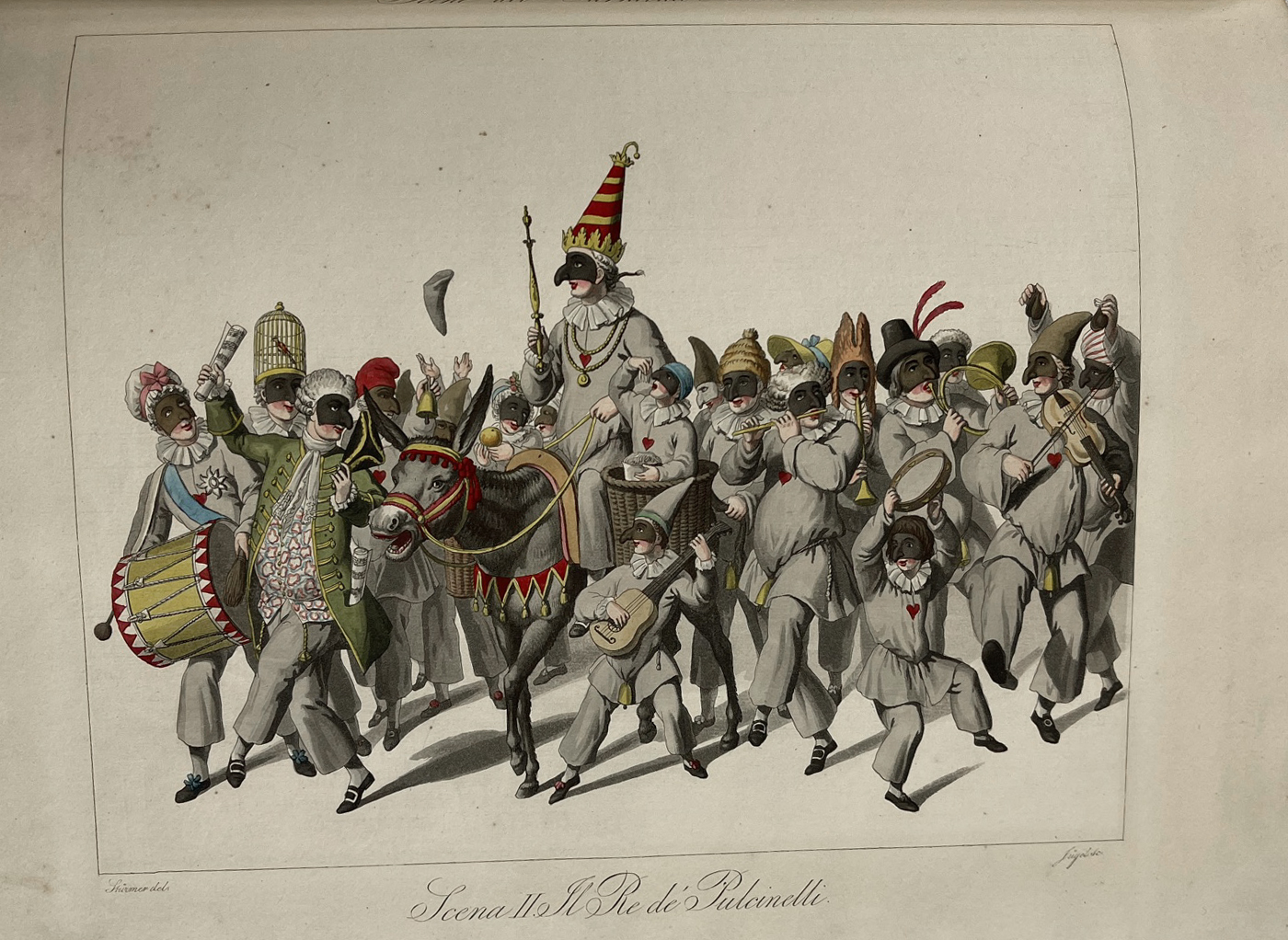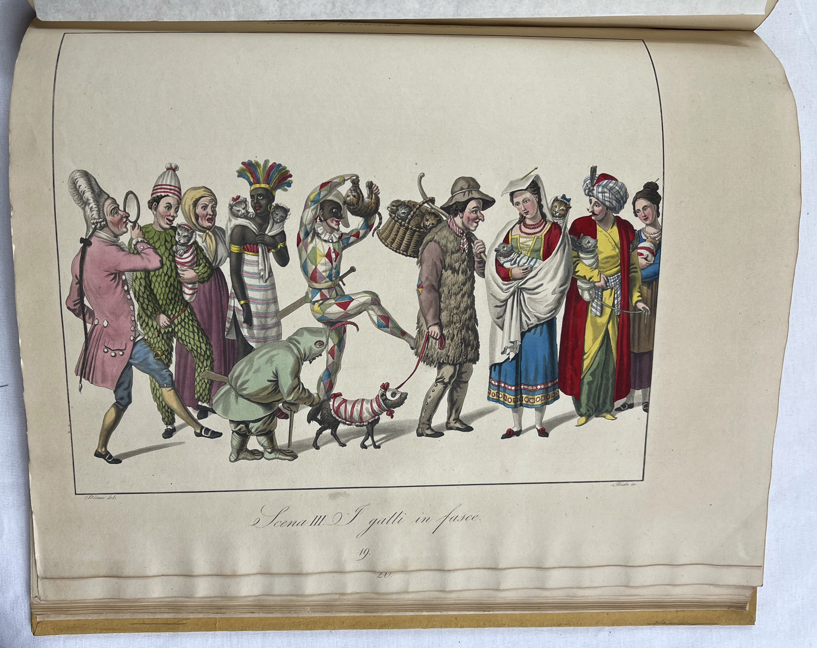 The magnificent aquatint panels initially show theatrical masks on 6 panels, followed by 14 panels with masks and festival scenes from Rome Carnival