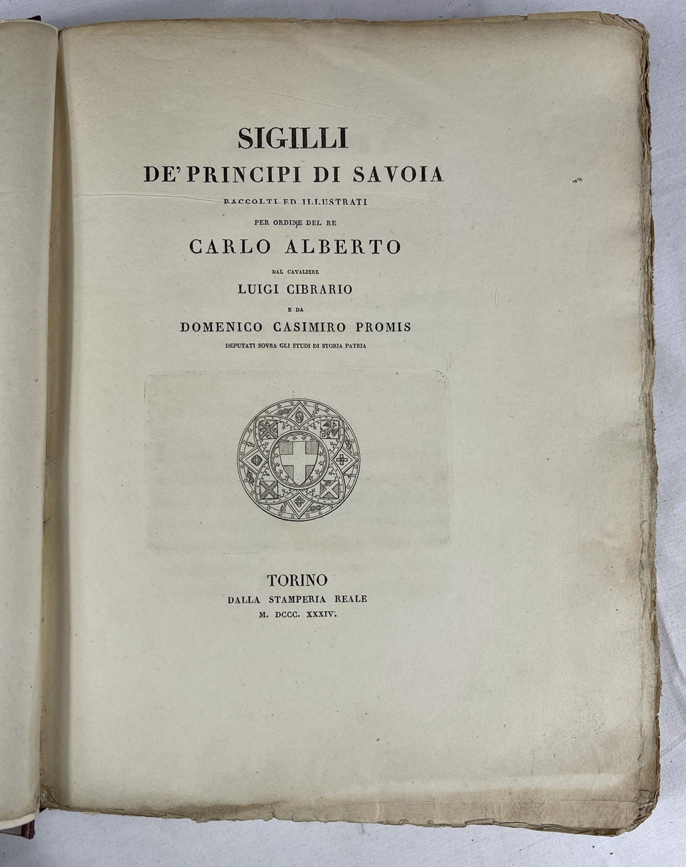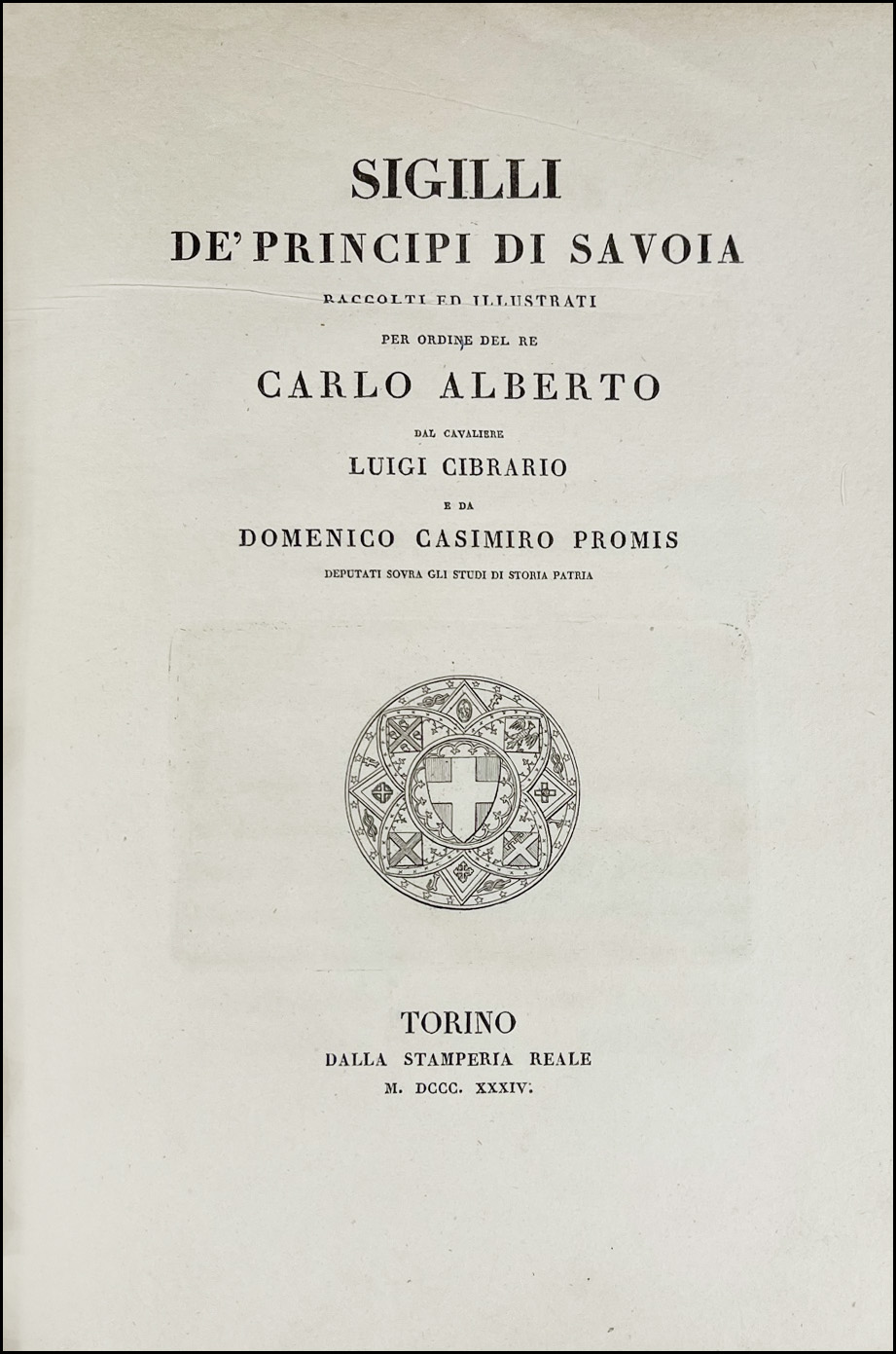 Cibrario, Luigi. Sigilli de' principi di Savoia / raccolti ed illustrati per ordine del re Carlo Alberto dal cavaliere Luigi Cibrario e da Domenico Casimiro Promis. Torino : dalla Stamperia Reale, 1834.