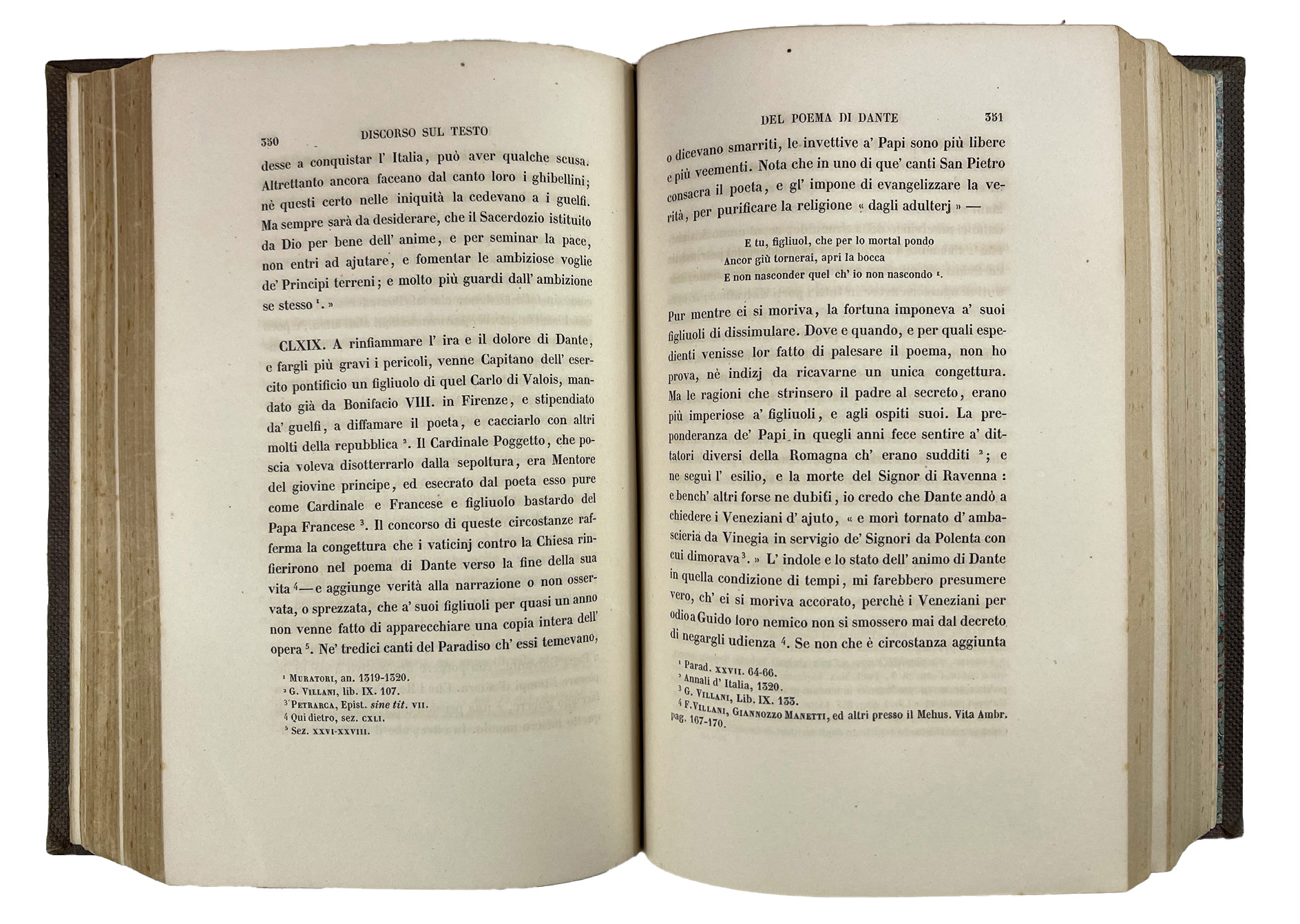 FIRST EDITION of the Divine Comedy edited by Ugo Foscolo. Foscolo began working on this project as early as 1820 but only the first volume (of the 5 that originally had to compose the work) was published in 1825 before his death. The preface to this edition bears the signature 'Un Italiano';