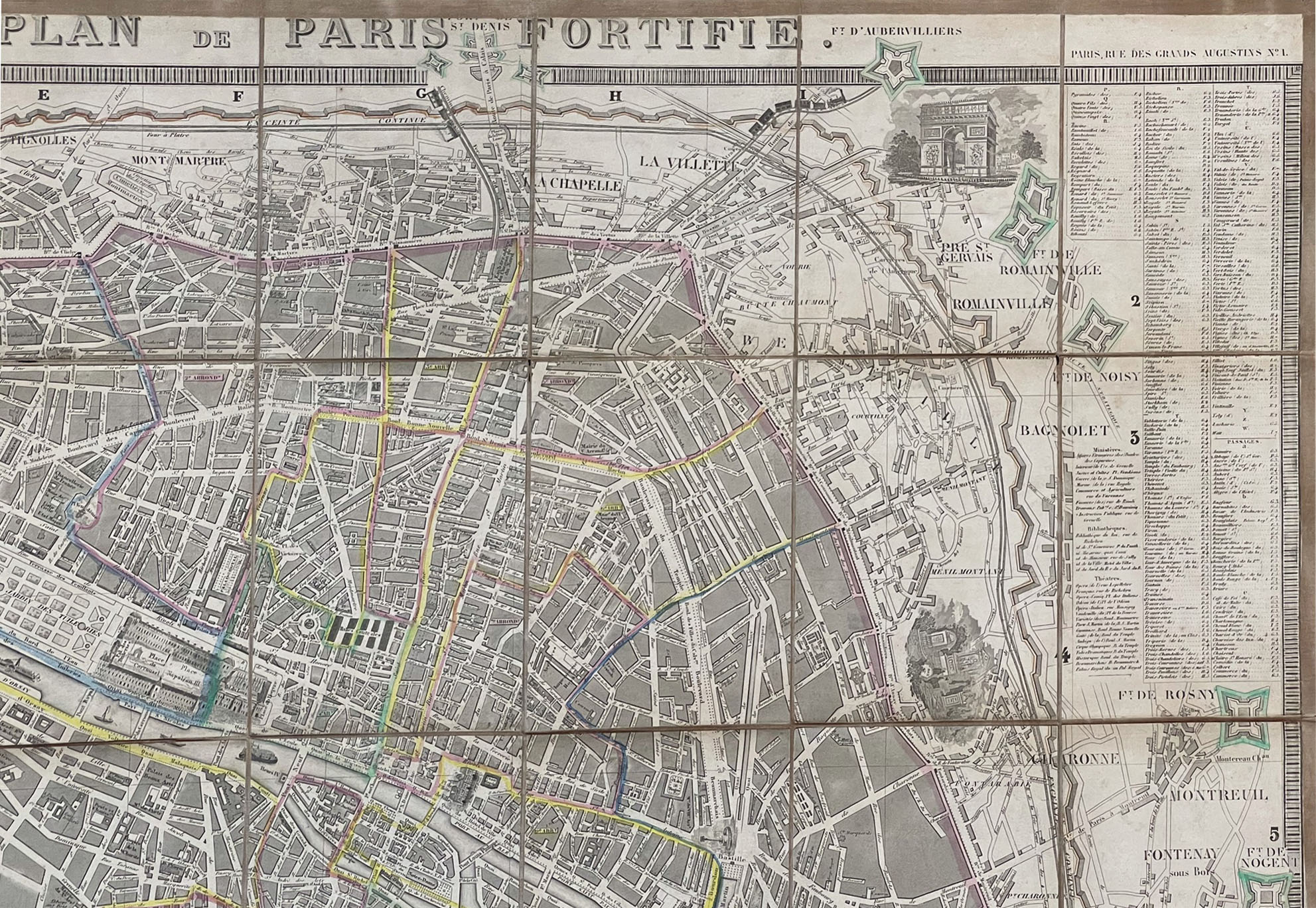 1 colored folding map of the city of Paris (61x90 cm) . At margin the list of the street names.