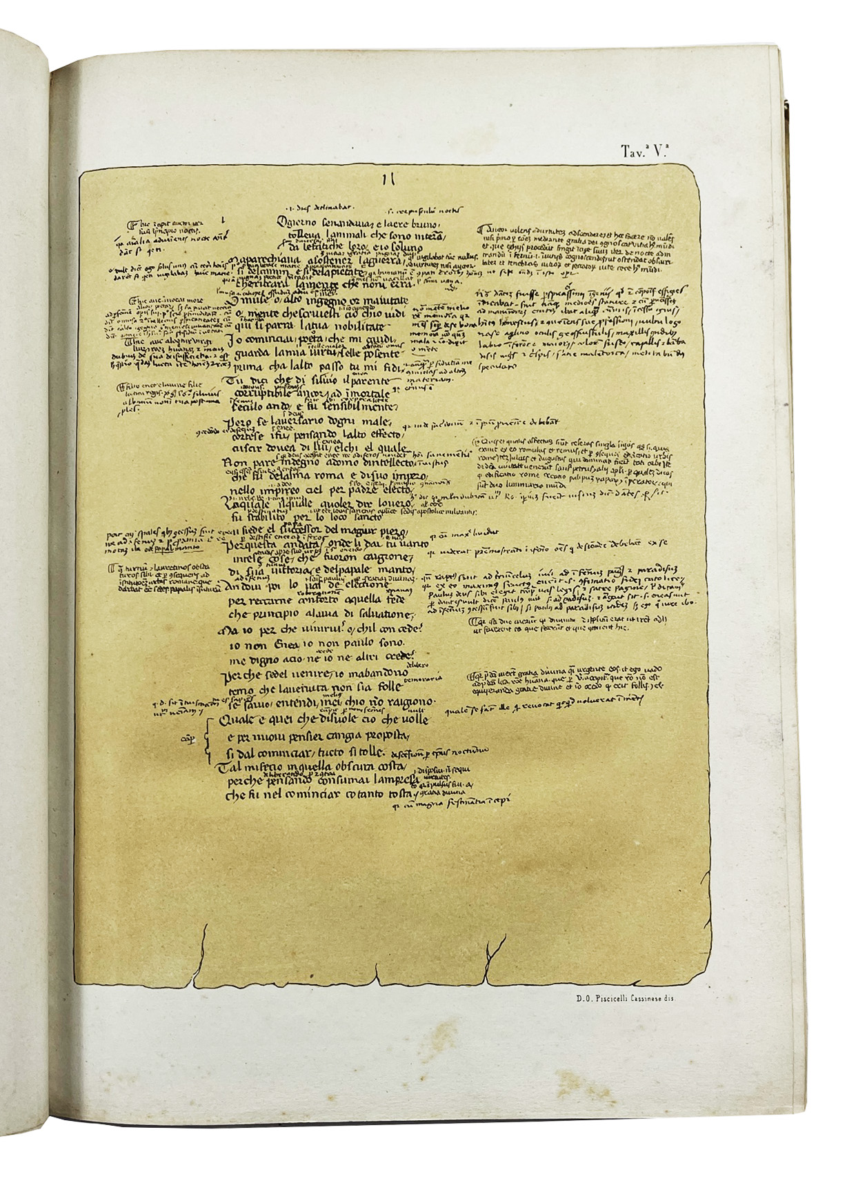 4to grande (mm 385x265). Pagine [4], LV, 592, [2]. Portrait of Dante and many photographic facsimiles of Dante's Code and others of the Archivio Cassinese.