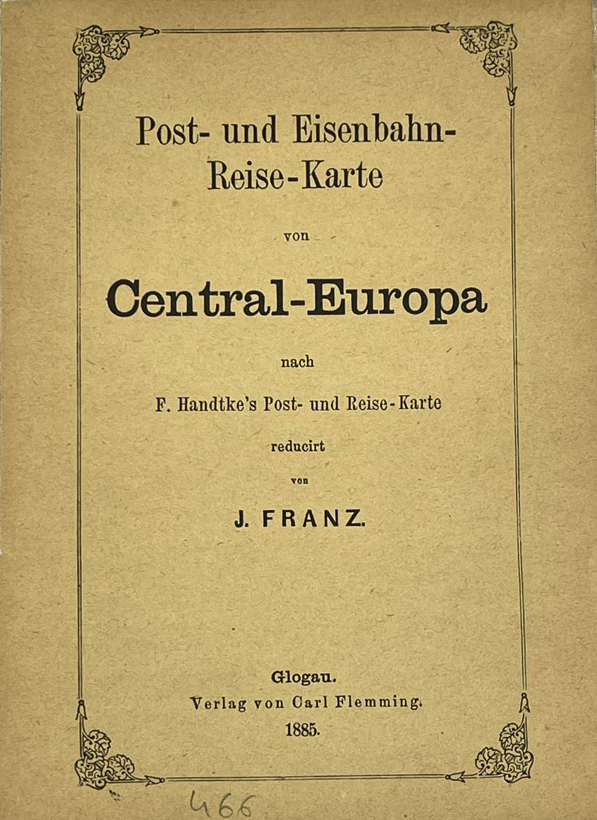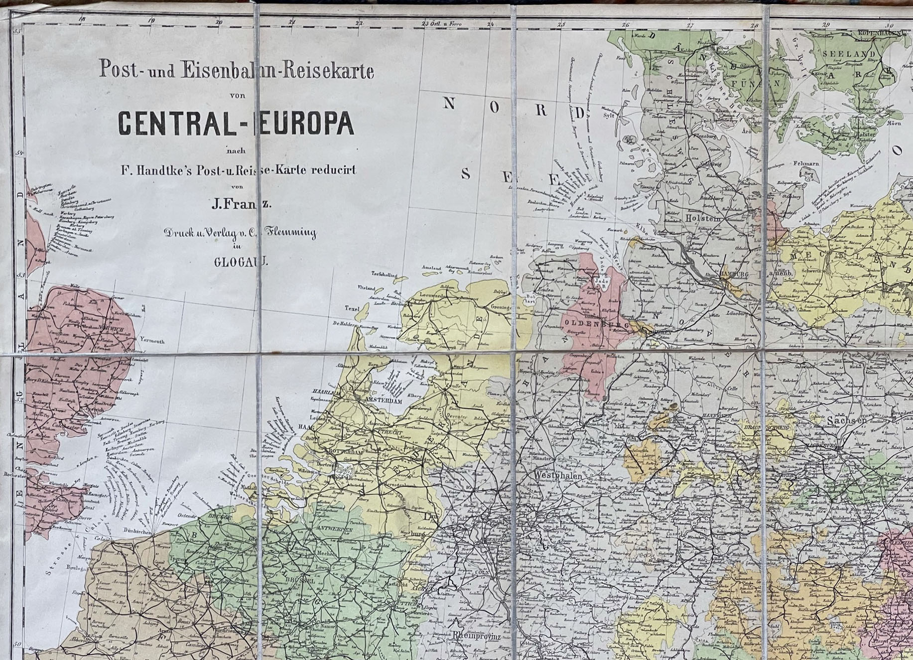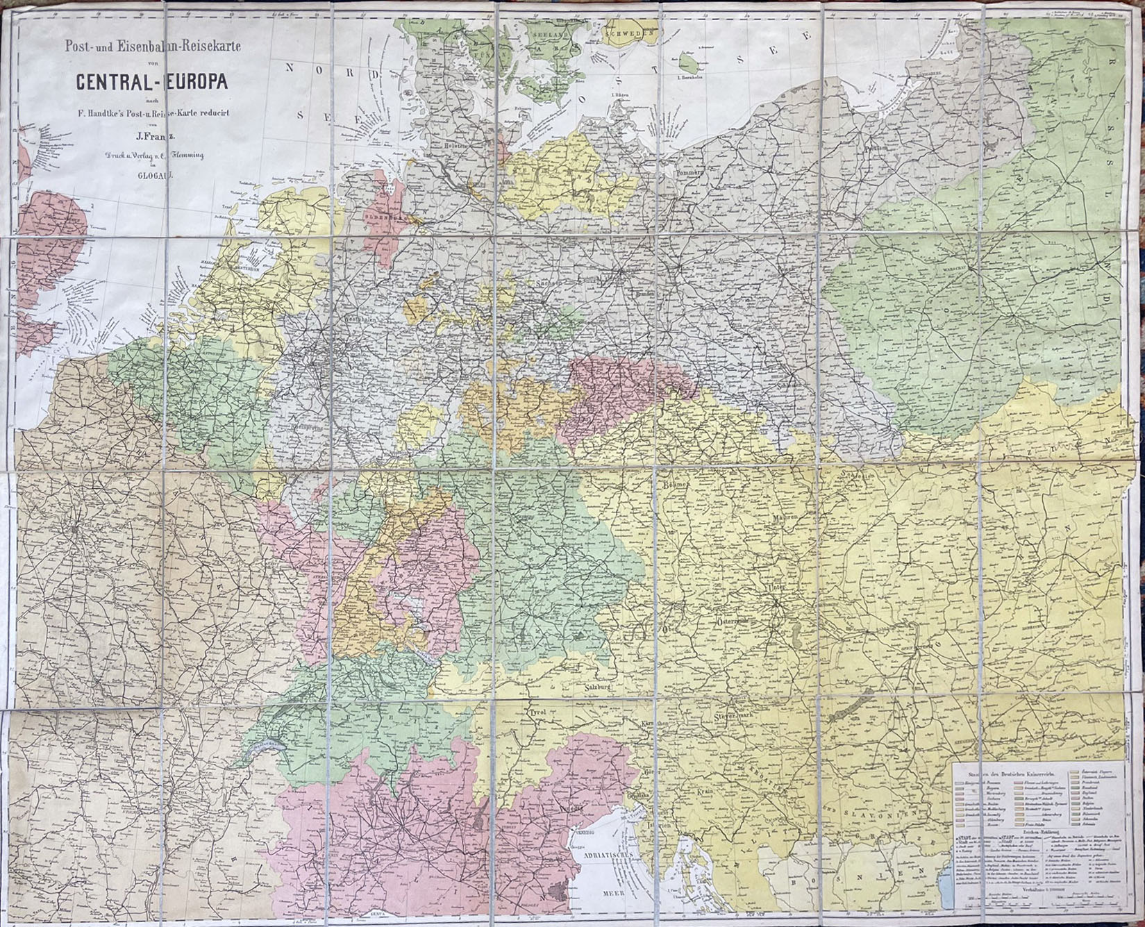 FRANZ, J. Post- und Eisenbahn-Reise-Karte von Central-Europa nach Handtke`s Post- und Reise-Karte . Glogau, Carl Flemming 1884.
